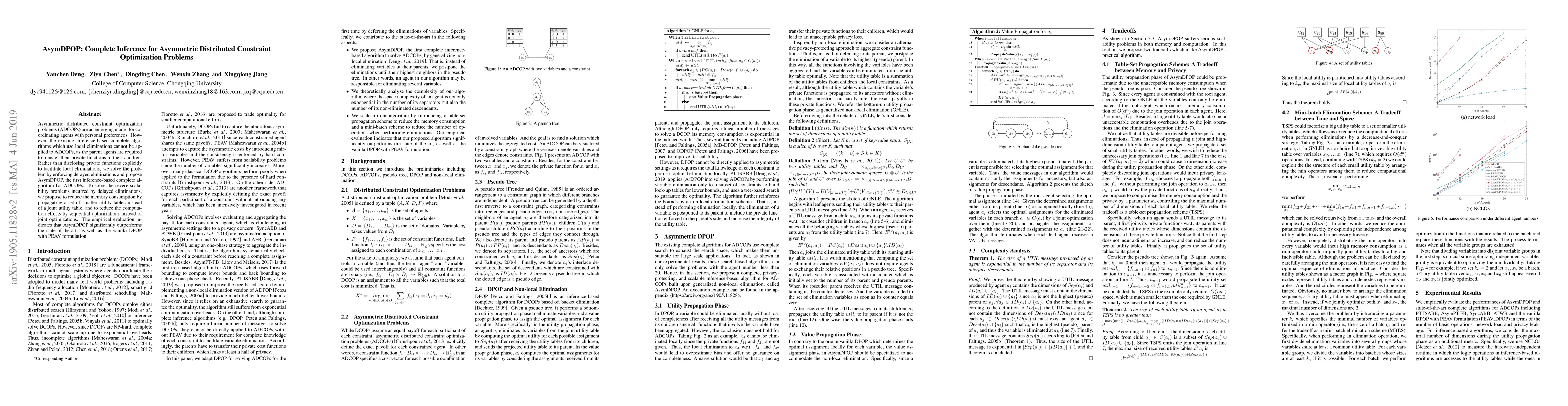 AsymDPOP introduces the first inference-based complete algorithm for asymmetric distributed constraint optimization problems (ADCOPs) by enforcing delayed eliminations, addressing scalability issues through smaller utility tables and sequential optimizations. Empirical evaluations show AsymDPOP significantly outperforms existing methods.