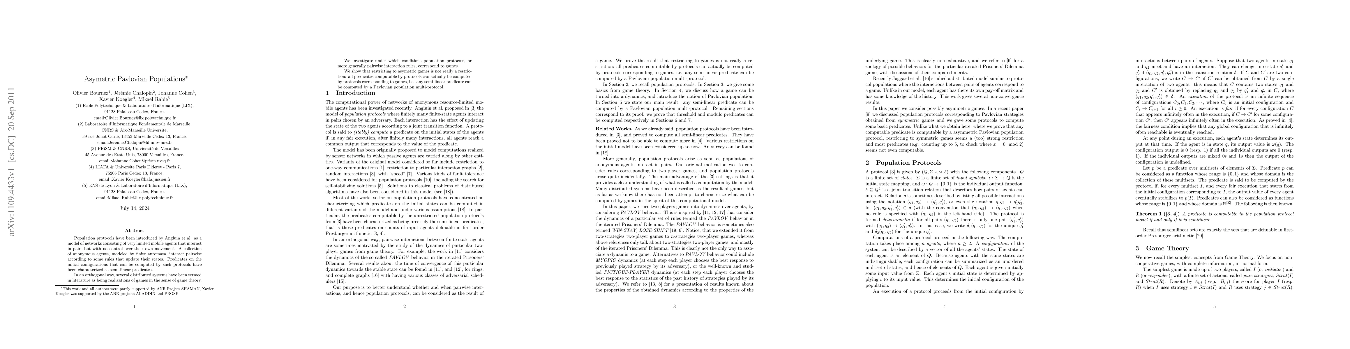 Population protocols have been introduced by Angluin et al. as a model of networks consisting of very limited mobile agents that interact in pairs but with no control over their own movement. A collection of anonymous agents, modeled by finite automata, interact pairwise according to some rules that update their states. Predicates on the initial configurations that can be computed by such protocols have been characterized as semi-linear predicates. In an orthogonal way, several distributed systems have been termed in literature as being realizations of games in the sense of game theory. We investigate under which conditions population protocols, or more generally pairwise interaction rules, correspond to games. We show that restricting to asymetric games is not really a restric- tion: all predicates computable by protocols can actually be computed by protocols corresponding to games, i.e. any semi-linear predicate can be computed by a Pavlovian population multi-protocol.