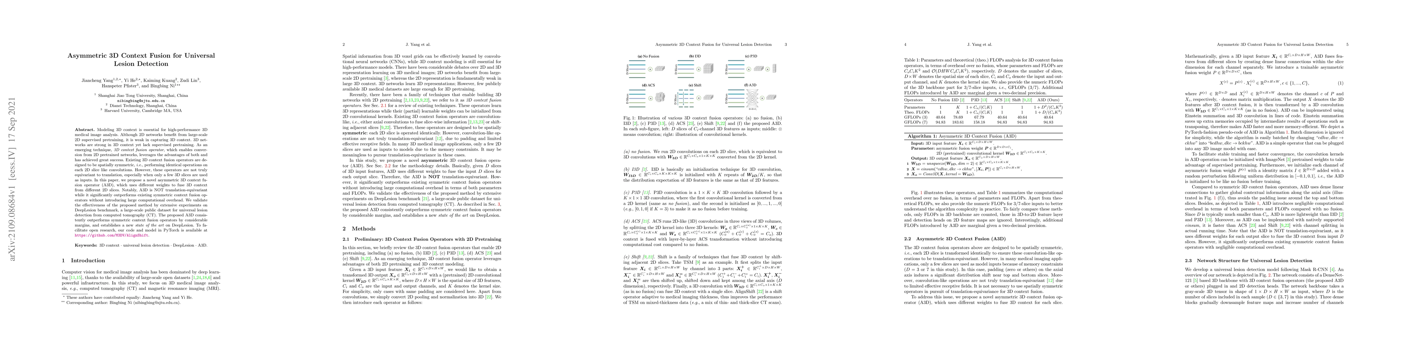 Modeling 3D context is essential for high-performance 3D medical image analysis. Although 2D networks benefit from large-scale 2D supervised pretraining, it is weak in capturing 3D context. 3D networks are strong in 3D context yet lack supervised pretraining. As an emerging technique, \emph{3D context fusion operator}, which enables conversion from 2D pretrained networks, leverages the advantages of both and has achieved great success. Existing 3D context fusion operators are designed to be spatially symmetric, i.e., performing identical operations on each 2D slice like convolutions. However, these operators are not truly equivariant to translation, especially when only a few 3D slices are used as inputs. In this paper, we propose a novel asymmetric 3D context fusion operator (A3D), which uses different weights to fuse 3D context from different 2D slices. Notably, A3D is NOT translation-equivariant while it significantly outperforms existing symmetric context fusion operators without introducing large computational overhead. We validate the effectiveness of the proposed method by extensive experiments on DeepLesion benchmark, a large-scale public dataset for universal lesion detection from computed tomography (CT). The proposed A3D consistently outperforms symmetric context fusion operators by considerable margins, and establishes a new \emph{state of the art} on DeepLesion. To facilitate open research, our code and model in PyTorch are available at https://github.com/M3DV/AlignShift.