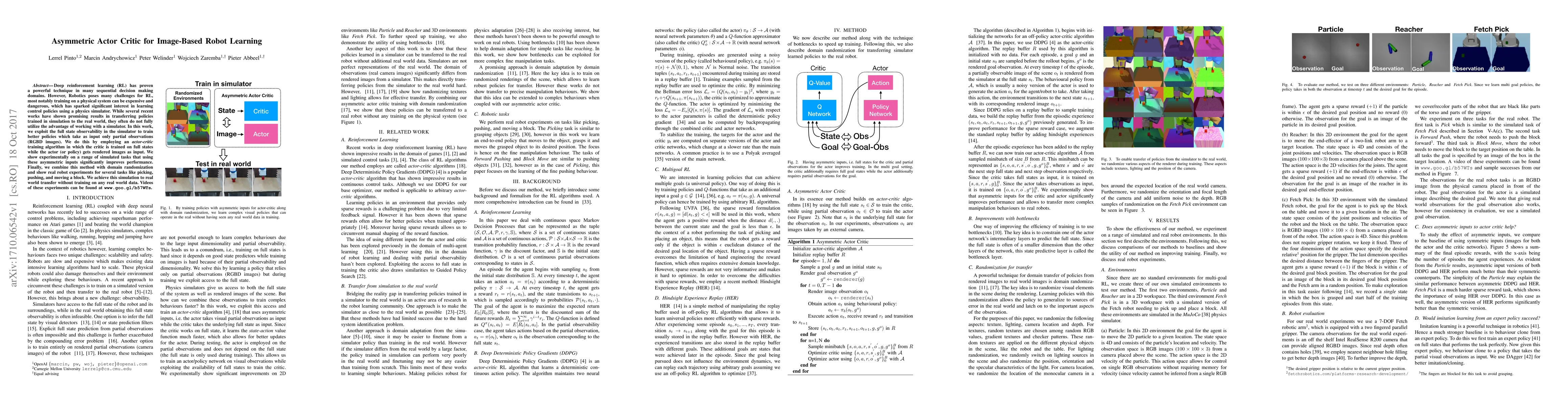 Researchers developed an asymmetric actor-critic method for image-based robot learning, improving performance on simulated tasks without requiring real-world data. The approach enabled successful transfer to real-world robots in various tasks like picking, pushing, and moving blocks.
