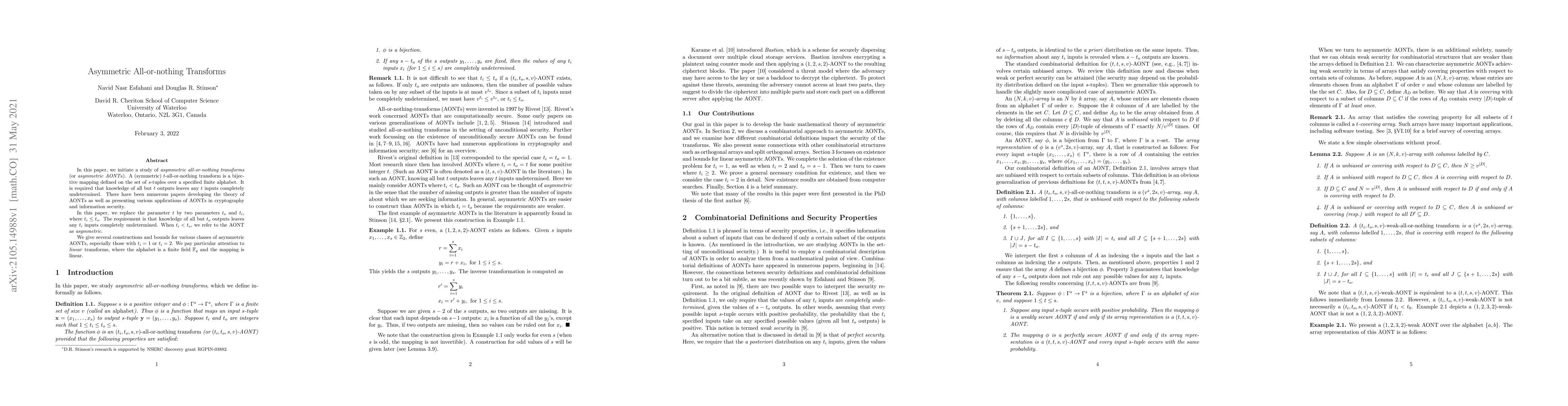 This paper explores asymmetric all-or-nothing transforms (AONTs) where knowledge of all but $t_o$ outputs leaves $t_i$ inputs undetermined, with $t_i < t_o$. It provides constructions and bounds for asymmetric AONTs, focusing on linear transforms over finite fields.