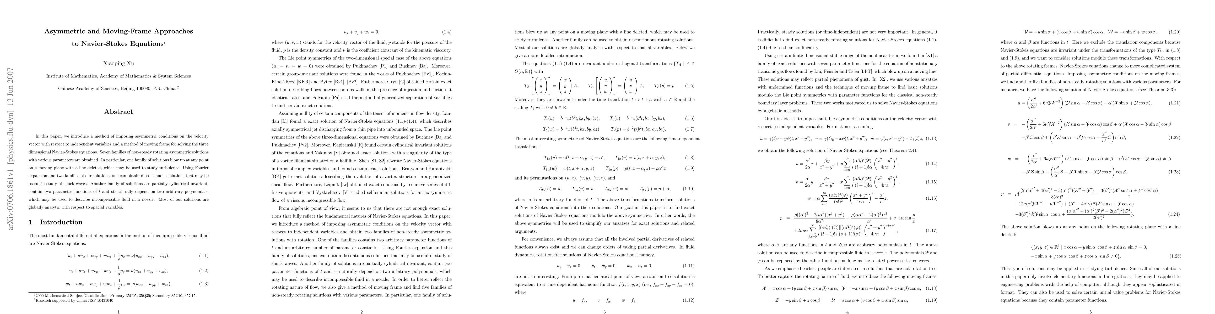 This paper proposes asymmetric conditions and a moving frame method to solve the three-dimensional Navier-Stokes equations, yielding seven families of non-steady rotating asymmetric solutions. Notably, one family exhibits blow-up behavior on a moving plane, potentially aiding turbulence studies, while another family provides discontinuous solutions useful for shock wave analysis.