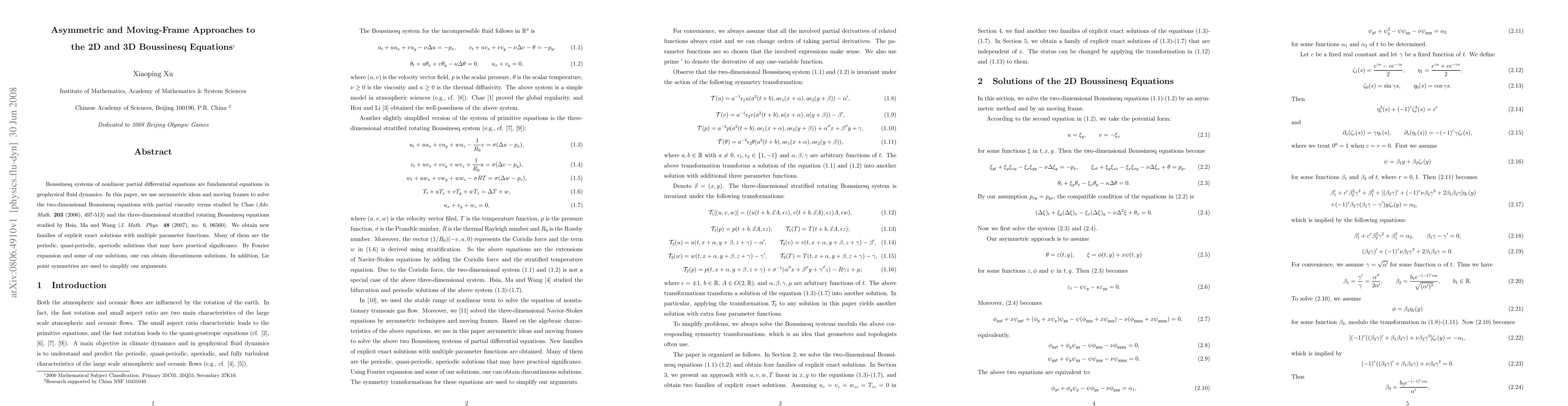 Boussinesq systems of nonlinear partial differential equations are fundamental equations in geophysical fluid dynamics. In this paper, we use asymmetric ideas and moving frames to solve the two-dimensional Boussinesq equations with partial viscosity terms studied by Chae ({\it Adv. Math.} {\bf 203} (2006), 497-513) and the three-dimensional stratified rotating Boussinesq equations studied by Hsia, Ma and Wang ({\it J. Math. Phys.} {\bf 48} (2007), no. 6, 06560). We obtain new families of explicit exact solutions with multiple parameter functions. Many of them are the periodic, quasi-periodic, aperiodic solutions that may have practical significance. By Fourier expansion and some of our solutions, one can obtain discontinuous solutions. In addition, Lie point symmetries are used to simplify our arguments.
