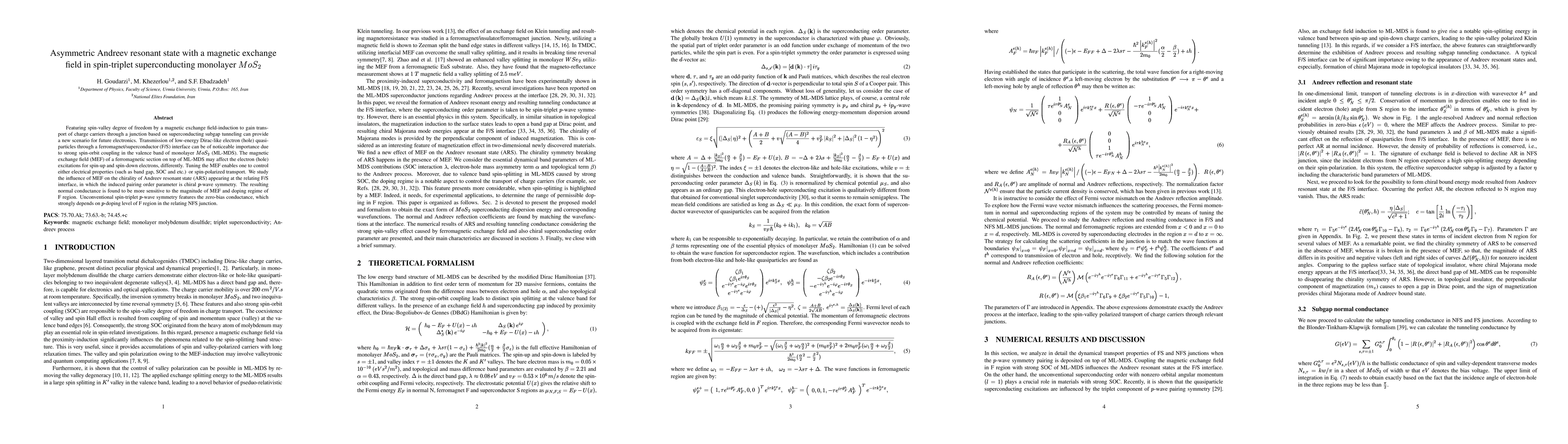 The paper investigates how a magnetic exchange field in a spin-triplet superconducting monolayer $MoS_2$ affects the Andreev resonant state at a ferromagnet/superconductor interface, revealing significant spin-polarized transport and a chiral $p$-wave pairing symmetry that impacts normal conductance. The study finds that the conductance is highly sensitive to the magnetic exchange field strength and doping levels.