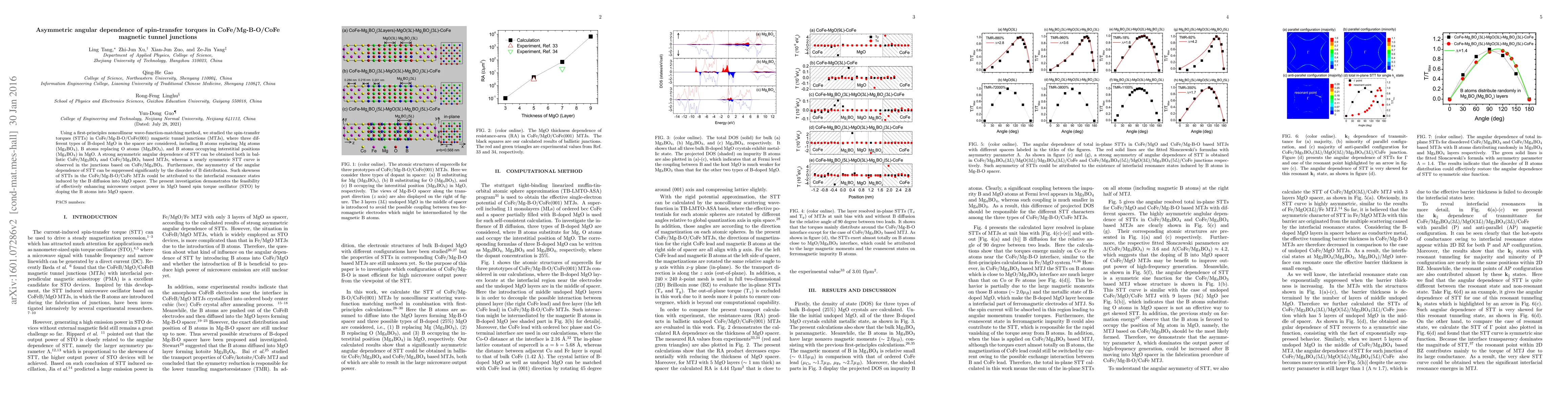 This study investigates spin-transfer torques (STTs) in CoFe/Mg-B-O/CoFe magnetic tunnel junctions using a first-principles method, revealing strong asymmetric angular dependence in junctions with B atoms replacing Mg or occupying interstitial positions, while junctions with B replacing O atoms show a nearly symmetric STT curve. The asymmetry can be suppressed by B distribution disorder, suggesting potential for enhancing microwave output power in spin torque oscillators through B doping.