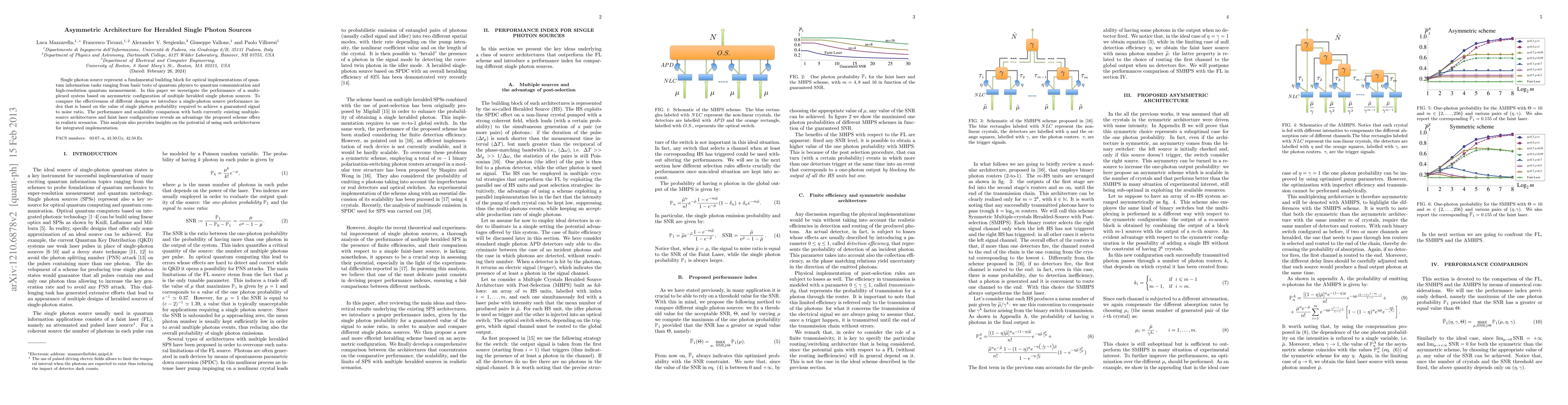 Single photon source represent a fundamental building block for optical implementations of quantum information tasks ranging from basic tests of quantum physics to quantum communication and high-resolution quantum measurement. In this paper we investigate the performance of a multiplexed system based on asymmetric configuration of multiple heralded single photon sources. {To compare the effectiveness of different designs we introduce a single-photon source performance index that is based on the value of single photon probability required to achieve a guaranteed signal to noise ratio.} The performance and scalability comparison with both currently existing multiple-source architectures and faint laser configurations reveals an advantage the proposed scheme offers in realistic scenarios. This analysis also provides insights on the potential of using such architectures for integrated implementation.