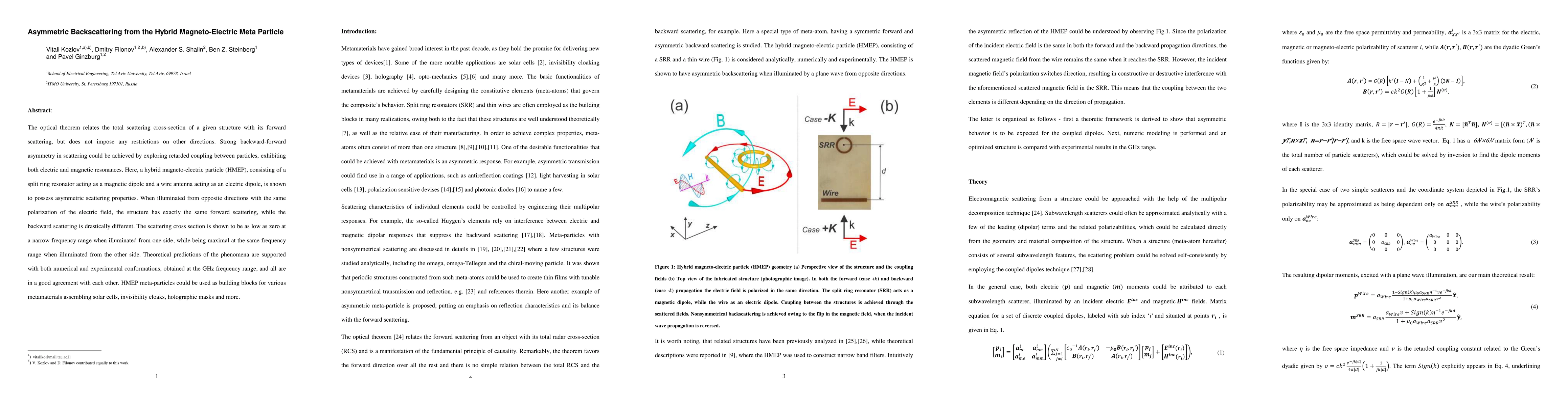 The optical theorem relates the total scattering cross-section of a given structure with its forward scattering, but does not impose any restrictions on other directions. Strong backward-forward asymmetry in scattering could be achieved by exploring retarded coupling between particles, exhibiting both electric and magnetic resonances. Here, a hybrid magneto-electric particle (HMEP), consisting of a split ring resonator acting as a magnetic dipole and a wire antenna acting as an electric dipole, is shown to possess asymmetric scattering properties. When illuminated from opposite directions with the same polarization of the electric field, the structure has exactly the same forward scattering, while the backward scattering is drastically different. The scattering cross section is shown to be as low as zero at a narrow frequency range when illuminated from one side, while being maximal at the same frequency range when illuminated from the other side. Theoretical predictions of the phenomena are supported with both numerical and experimental conformations, obtained at the GHz frequency range, and all are in a good agreement with each other. HMEP meta-particles could be used as building blocks for various metamaterials assembling solar cells, invisibility cloaks, holographic masks and more.