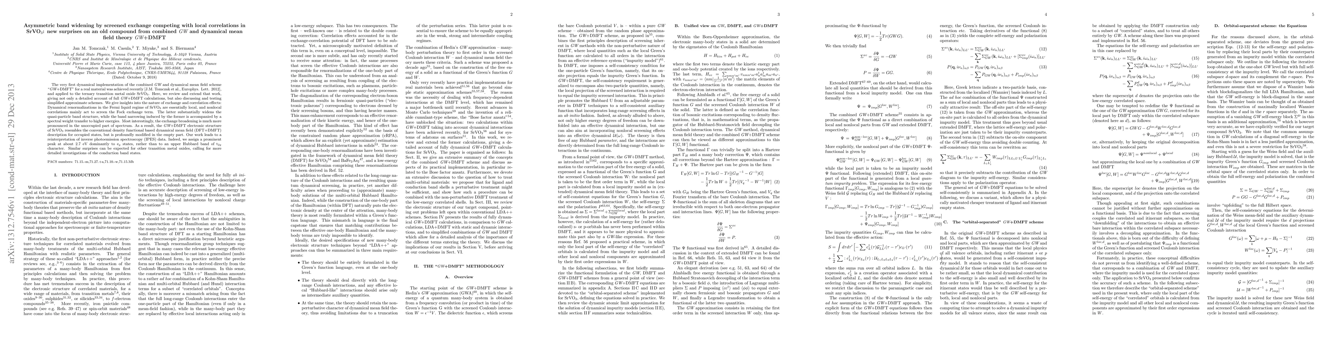 This paper explores the electronic structure of SrVO3 using combined GW and dynamical mean field theory (GW+DMFT), revealing asymmetric band widening due to screened exchange competing with local correlations. The study reinterprets inverse photoemission spectroscopy data, attributing a peak at 2.7 eV to eg states rather than an upper Hubbard band of t2g character.
