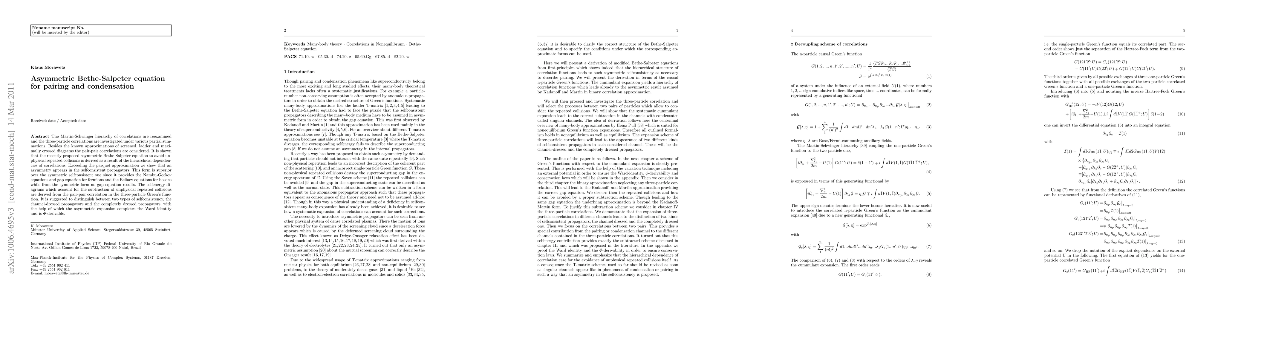 The Martin-Schwinger hierarchy of correlations are reexamined and the three-particle correlations are investigated under various partial summations. Besides the known approximations of screened, ladder and maximally crossed diagrams the pair-pair correlations are considered. It is shown that the recently proposed asymmetric Bethe-Salpeter equation to avoid unphysical repeated collisions is derived as a result of the hierarchical dependencies of correlations. Exceeding the parquet approximation we show that an asymmetry appears in the selfconsistent propagators. This form is superior over the symmetric selfconsistent one since it provides the Nambu-Gorkov equations and gap equation for fermions and the Beliaev equations for bosons while from the symmetric form no gap equation results. The selfenergy diagrams which account for the subtraction of unphysical repeated collisions are derived from the pair-pair correlation in the three-particle Greenfunction. It is suggested to distinguish between two types of selfconsistency, the channel-dressed propagators and the completely dressed propagators, with the help of which the asymmetric expansion completes the Ward identity and is $\Phi$-derivable.