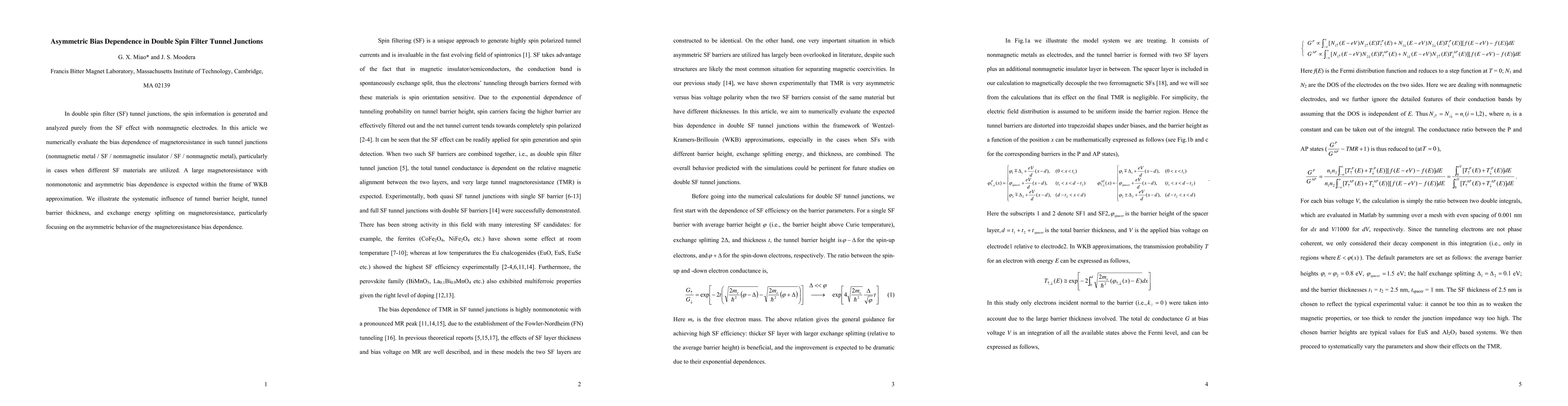 This paper numerically evaluates the asymmetric bias dependence of magnetoresistance in double spin filter tunnel junctions, highlighting the influence of tunnel barrier properties and the expectation of nonmonotonic behavior within the WKB approximation. The study focuses on how different spin filter materials affect the asymmetric behavior of magnetoresistance.