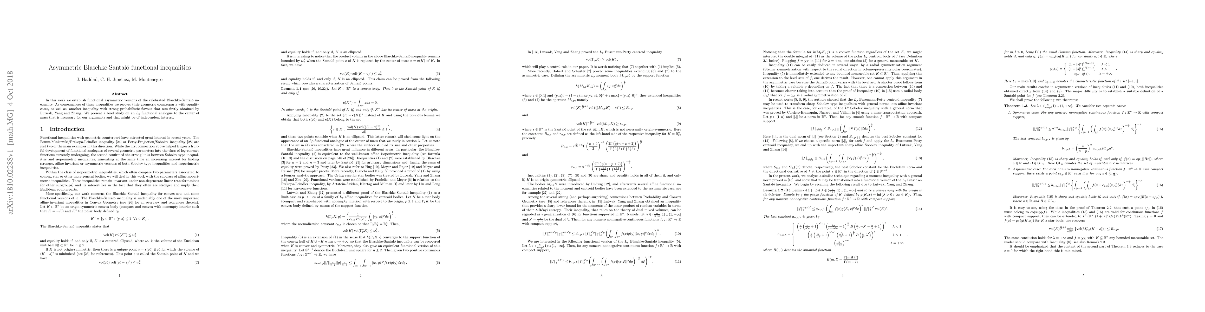 This paper establishes asymmetric versions of the Blaschke-Santaló inequality, deriving geometric counterparts and a probabilistic inequality first found by Lutwak, Yang, and Zhang. It also explores an $L_p$ functional analogue to the center of mass, potentially of independent interest.
