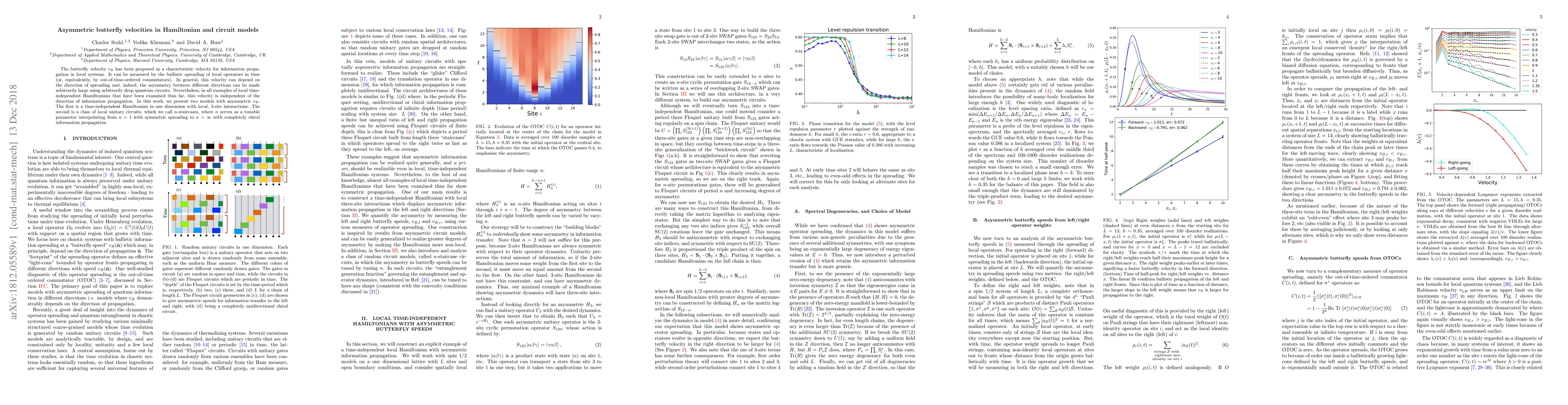 The butterfly velocity $v_B$ has been proposed as a characteristic velocity for information propagation in local systems. It can be measured by the ballistic spreading of local operators in time (or, equivalently, by out-of-time-ordered commutators). In general, this velocity can depend on the direction of spreading and, indeed, the asymmetry between different directions can be made arbitrarily large using arbitrarily deep quantum circuits. Nevertheless, in almost all examples of local time-independent Hamiltonians that have been examined thus far, this velocity is independent of the direction of information propagation. In this work, we present two models with asymmetric $v_B$. The first is a time-independent Hamiltonian in one dimension with local, 3-site interactions. The second is a class of local unitary circuits, which we call $n$-staircases, where $n$ serves as a tunable parameter interpolating from $n=1$ with symmetric spreading to $n=\infty$ with completely chiral information propagation.