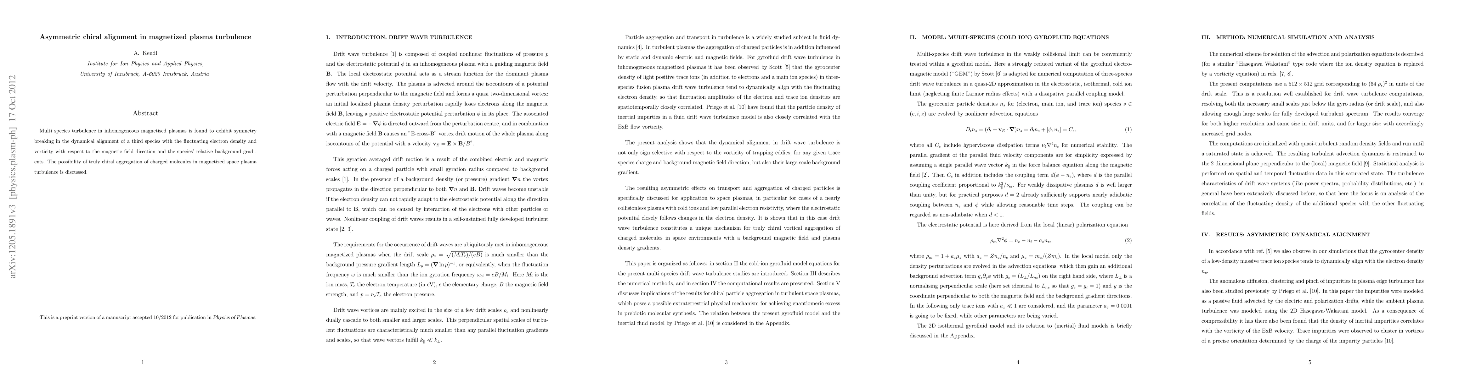 This study reveals that multi-species turbulence in magnetized plasmas can lead to asymmetric chiral alignment of a third species, correlating with electron density fluctuations and vorticity relative to magnetic field directions. The research explores the potential for chiral aggregation of charged particles in space plasma turbulence.