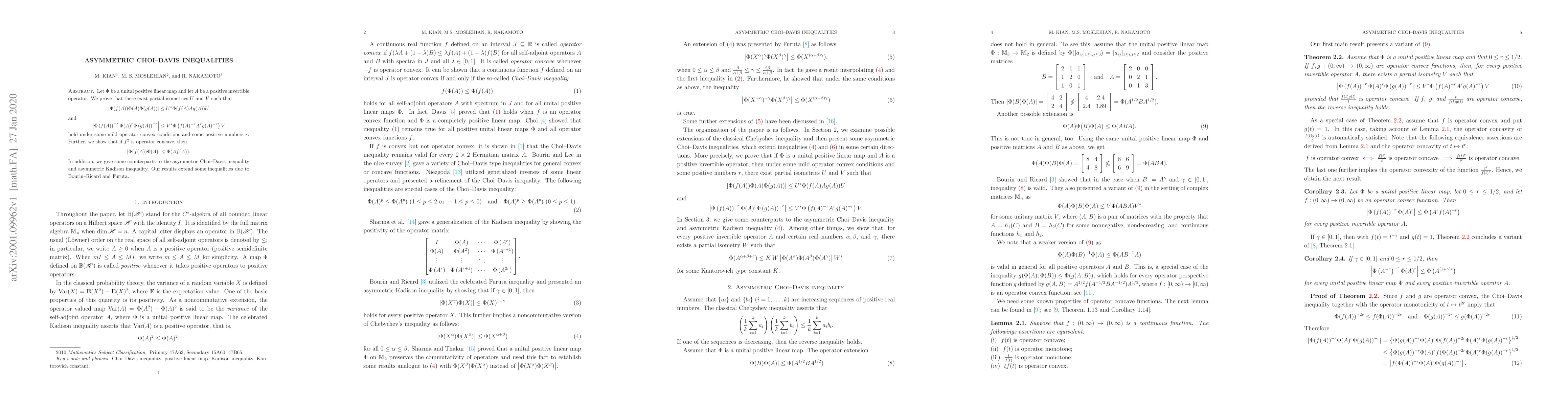 Let $\Phi$ be a unital positive linear map and let $A$ be a positive invertible operator. We prove that there exist partial isometries $U$ and $V$ such that \[ |\Phi(f(A))\Phi(A)\Phi(g(A))|\leq U^*\Phi(f(A)Ag(A))U \] and \[\left|\Phi\left(f(A)\right)^{-r}\Phi(A)^r\Phi\left(g(A)\right)^{-r}\right|\leq V^*\Phi\left(f(A)^{-r}A^rg(A)^{-r}\right)V\] hold under some mild operator convex conditions and some positive numbers $r$. Further, we show that if $f^2$ is operator concave, then $$ |\Phi(f(A))\Phi(A)|\leq \Phi(Af(A)).$$ In addition, we give some counterparts to the asymmetric Choi--Davis inequality and asymmetric Kadison inequality. Our results extend some inequalities due to Bourin--Ricard and Furuta.