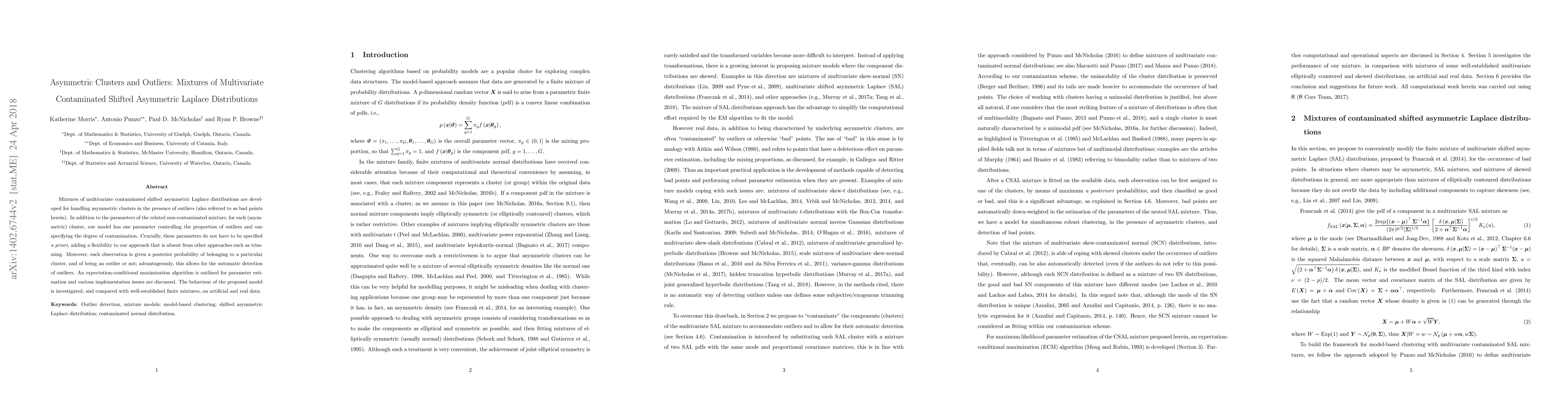 This paper proposes mixtures of multivariate contaminated shifted asymmetric Laplace distributions to manage asymmetric clusters and outliers. It introduces parameters for outlier proportion and contamination degree, estimated automatically rather than specified a priori, and uses an expectation-conditional maximization algorithm for parameter estimation. The model is evaluated against established finite mixtures on both artificial and real datasets.
