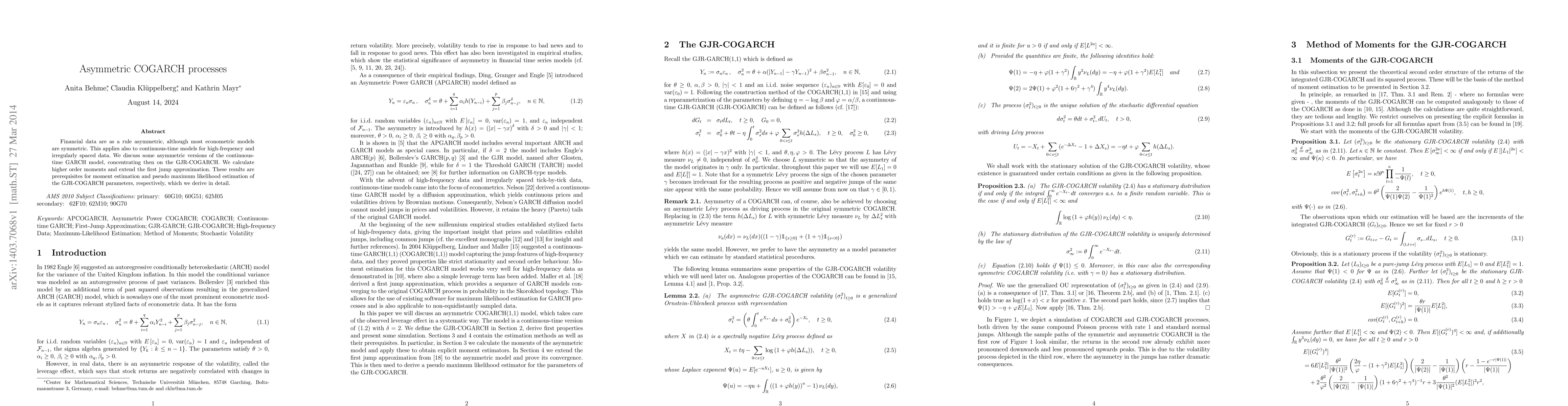 This paper explores asymmetric versions of continuous-time GARCH models, focusing on the GJR-COGARCH model. It derives higher order moments and extends the first jump approximation, providing foundational results for parameter estimation and pseudo maximum likelihood estimation.
