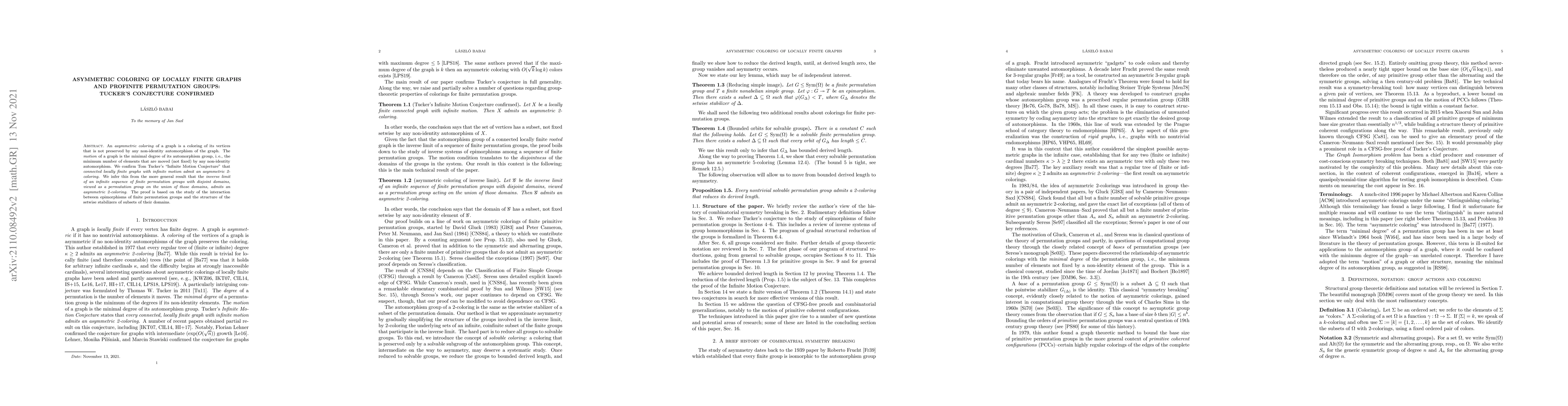 This paper confirms Tom Tucker's "Infinite Motion Conjecture" by proving that connected locally finite graphs with infinite motion can be asymmetric 2-colored. The proof leverages the interaction between epimorphisms of finite permutation groups and the structure of their setwise stabilizers.