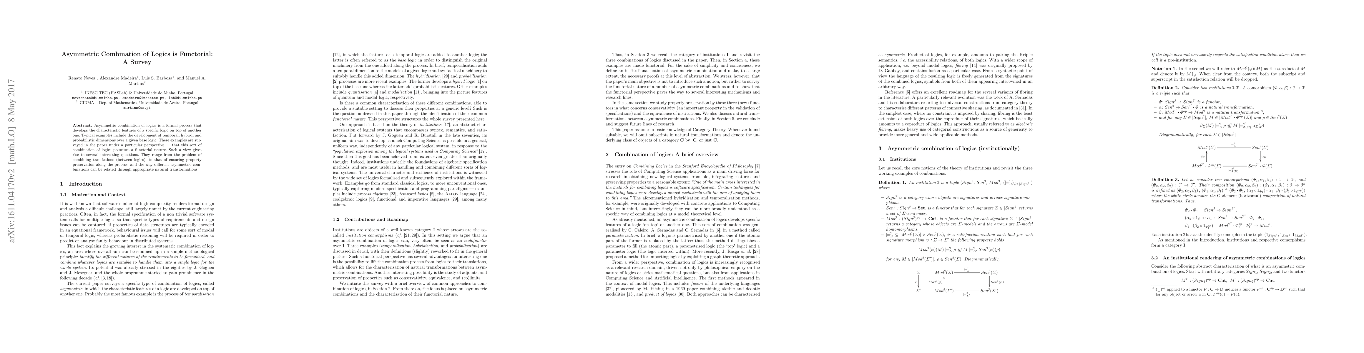 Asymmetric combination of logics is a formal process that develops the characteristic features of a specific logic on top of another one. Typical examples include the development of temporal, hybrid, and probabilistic dimensions over a given base logic. These examples are surveyed in the paper under a particular perspective - that this sort of combination of logics possesses a functorial nature. Such a view gives rise to several interesting questions. They range from the problem of combining translations (between logics), to that of ensuring property preservation along the process, and the way different asymmetric combinations can be related through appropriate natural transformations.