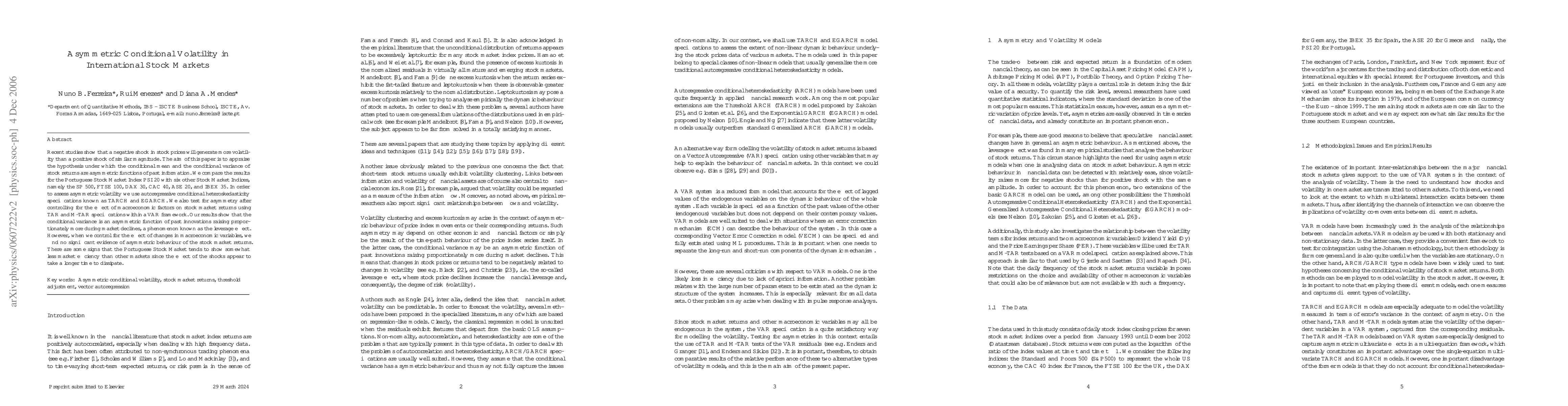 Recent studies show that a negative shock in stock prices will generate more volatility than a positive shock of similar magnitude. The aim of this paper is to appraise the hypothesis under which the conditional mean and the conditional variance of stock returns are asymmetric functions of past information. We compare the results for the Portuguese Stock Market Index PSI 20 with six other Stock Market Indices, namely the S&P 500, FTSE100, DAX 30, CAC 40, ASE 20, and IBEX 35. In order to assess asymmetric volatility we use autoregressive conditional heteroskedasticity specifications known as TARCH and EGARCH. We also test for asymmetry after controlling for the effect of macroeconomic factors on stock market returns using TAR and M-TAR specifications within a VAR framework. Our results show that the conditional variance is an asymmetric function of past innovations raising proportionately more during market declines, a phenomenon known as the leverage effect. However, when we control for the effect of changes in macroeconomic variables, we find no significant evidence of asymmetric behaviour of the stock market returns. There are some signs that the Portuguese Stock Market tends to show somewhat less market efficiency than other markets since the effect of the shocks appear to take a longer time to dissipate.