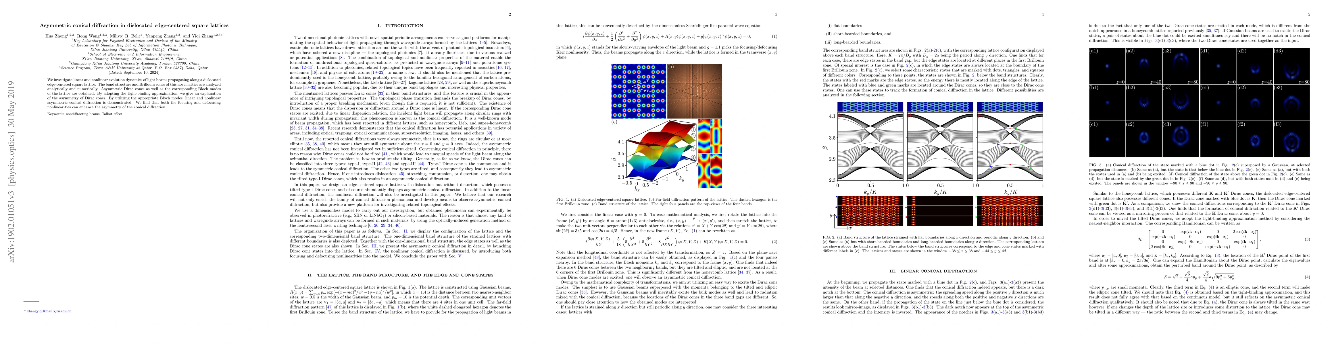We investigate linear and nonlinear evolution dynamics of light beams propagating along a dislocated edge-centered square lattice. The band structure and Brillouin zones of this novel lattice are analyzed analytically and numerically. Asymmetric Dirac cones as well as the corresponding Bloch modes of the lattice are obtained. By adopting the tight-binding approximation, we give an explanation of the asymmetry of Dirac cones. By utilizing the appropriate Bloch modes, linear and nonlinear asymmetric conical diffraction is demonstrated. We find that both the focusing and defocusing nonlinearities can enhance the asymmetry of the conical diffraction.
