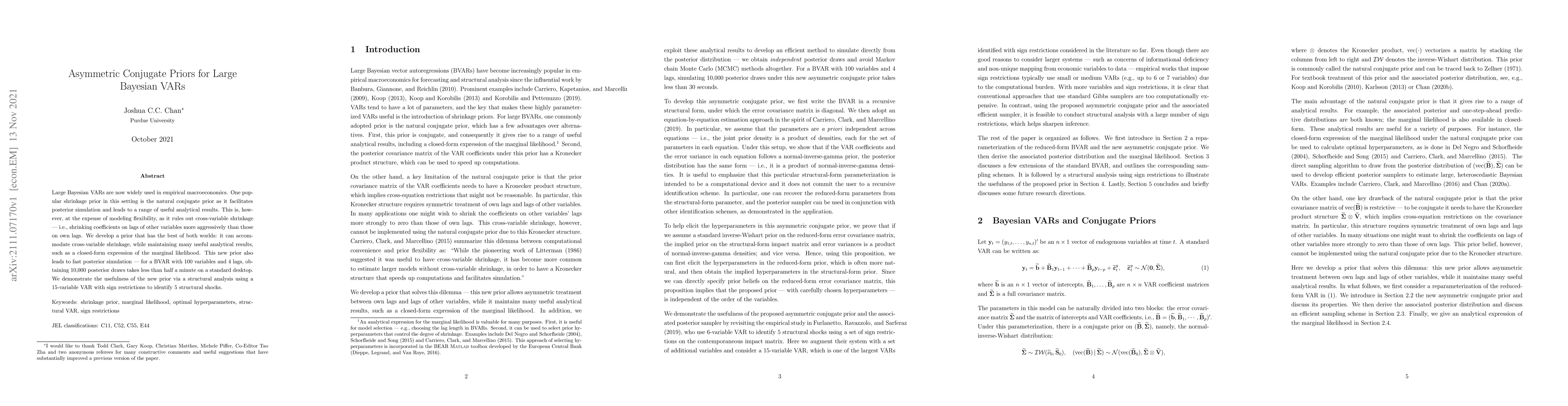 The paper develops an asymmetric conjugate prior for large Bayesian VARs, accommodating cross-variable shrinkage while maintaining analytical results and efficient posterior simulation.