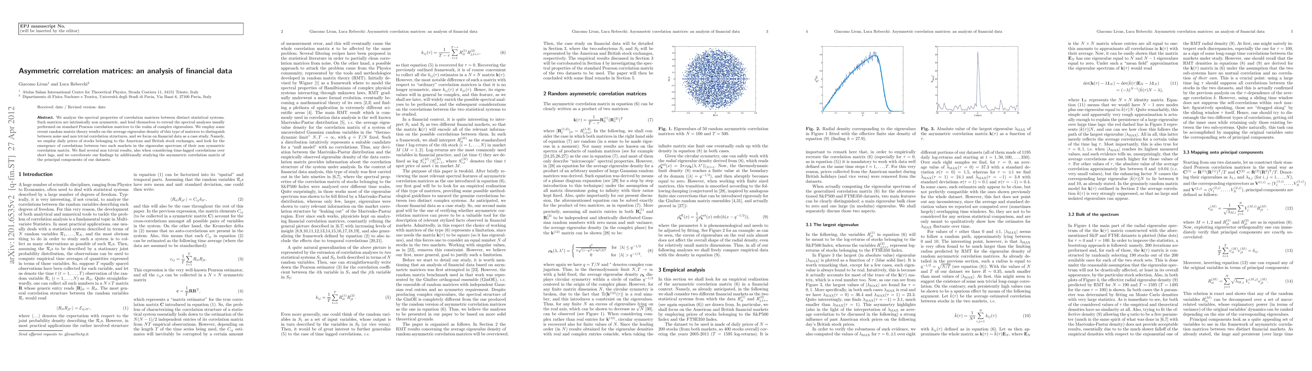 This paper investigates the spectral properties of asymmetric correlation matrices between American and British stock markets, extending traditional correlation analysis to complex eigenvalues. Using random matrix theory, the authors identify non-trivial correlations in financial data, revealing significant results even with short time-lagged correlations.