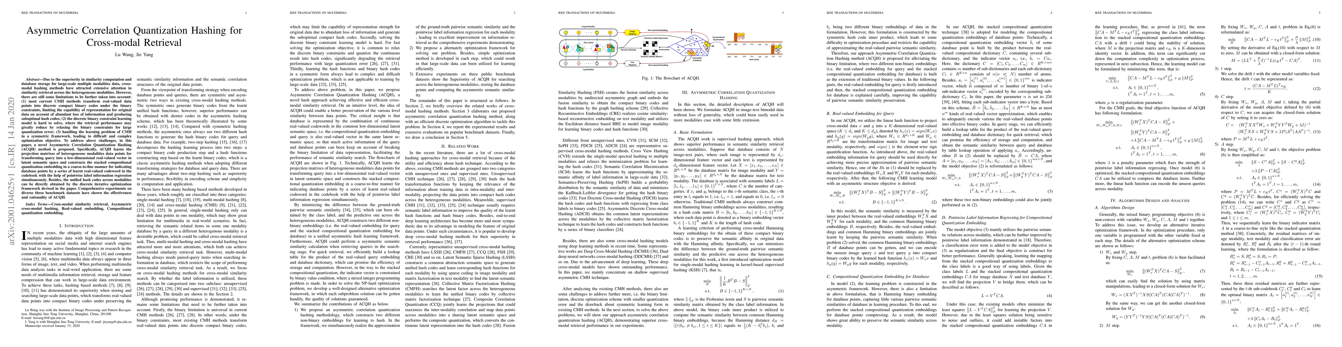 A new method called Asymmetric Correlation Quantization Hashing (ACQH) is proposed to address limitations in cross-modal hashing methods. ACQH learns projection matrices for transforming data points into real-valued vectors and constructs stacked compositional quantization embeddings for retrieving database points.