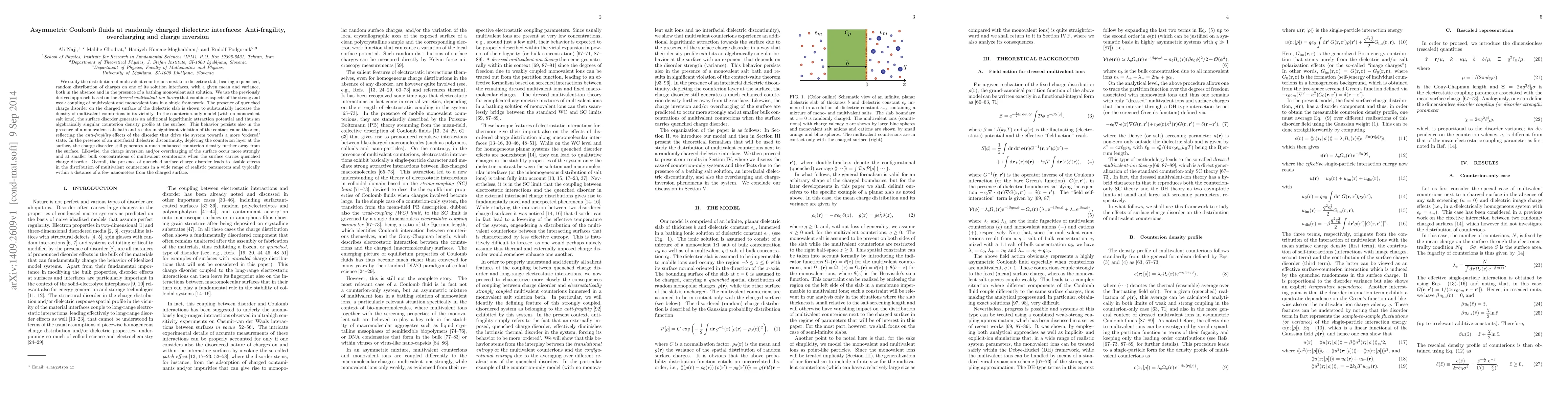 This study investigates the behavior of multivalent counterions near a dielectric slab with randomly charged interfaces, revealing that quenched charge disorder significantly increases counterion density and leads to phenomena like anti-fragility, overcharging, and charge inversion, especially under the influence of monovalent salt solutions. The disorder generates a logarithmic attraction potential, violating the contact-value theorem and enhancing counterion distribution over a few nanometers.