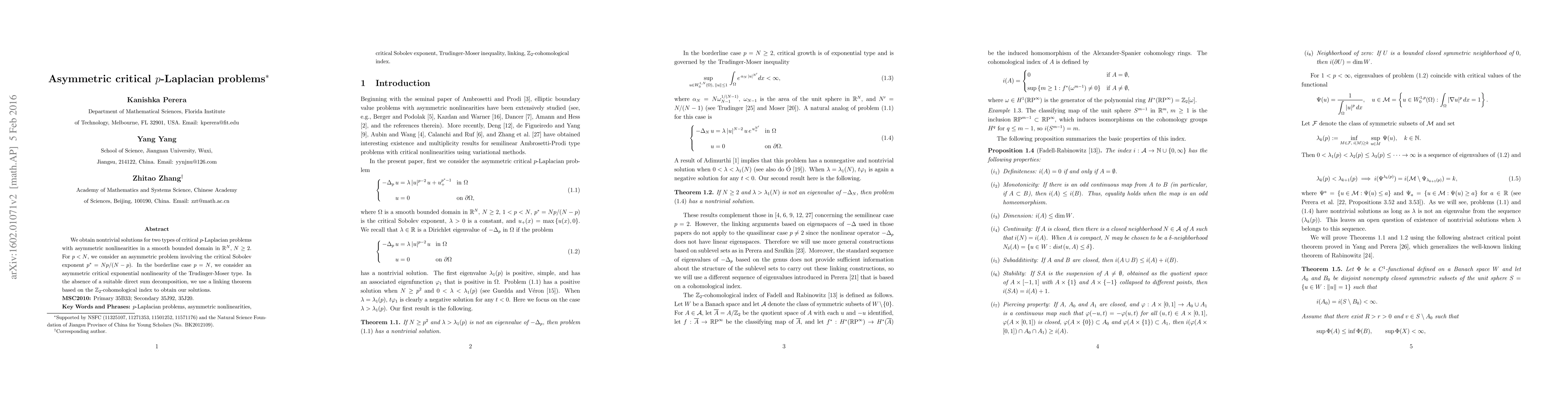 We obtain nontrivial solutions for two types of critical $p$-Laplacian problems with asymmetric nonlinearities in a smooth bounded domain in ${\mathbb R}^N,\, N \ge 2$. For $p < N$, we consider an asymmetric problem involving the critical Sobolev exponent $p^\ast = Np/(N - p)$. In the borderline case $p = N$, we consider an asymmetric critical exponential nonlinearity of the Trudinger-Moser type. In the absence of a suitable direct sum decomposition, we use a linking theorem based on the ${\mathbb Z}_2$-cohomological index to obtain our solutions.