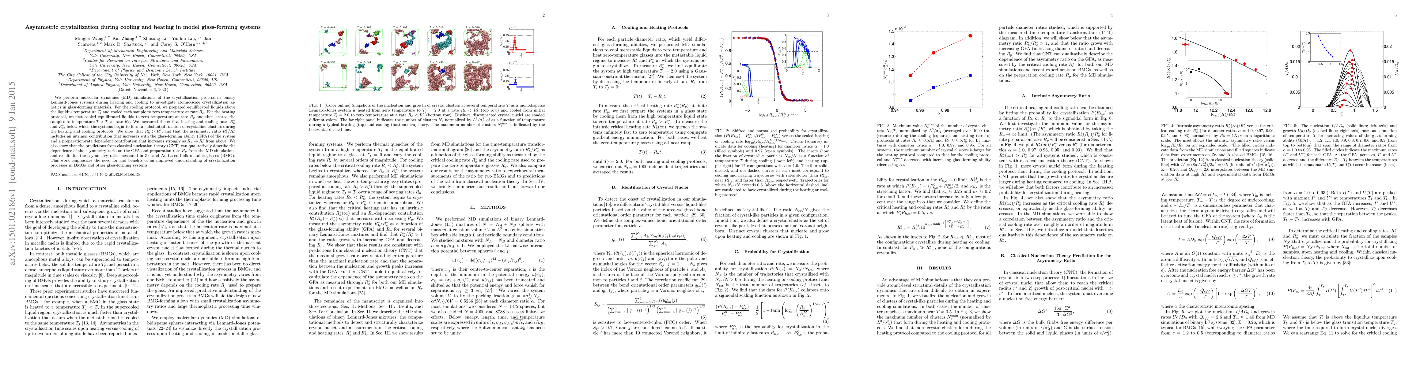 We perform molecular dynamics (MD) simulations of the crystallization process in binary Lennard-Jones systems during heating and cooling to investigate atomic-scale crystallization kinetics in glass-forming materials. For the cooling protocol, we prepared equilibrated liquids above the liquidus temperature $T_l$ and cooled each sample to zero temperature at rate $R_c$. For the heating protocol, we first cooled equilibrated liquids to zero temperature at rate $R_p$ and then heated the samples to temperature $T > T_l$ at rate $R_h$. We measured the critical heating and cooling rates $R_h^*$ and $R_c^*$, below which the systems begin to form a substantial fraction of crystalline clusters during the heating and cooling protocols. We show that $R_h^* > R_c^*$, and that the asymmetry ratio $R_h^*/R_c^*$ includes an intrinsic contribution that increases with the glass-forming ability (GFA) of the system and a preparation-rate dependent contribution that increases strongly as $R_p \rightarrow R_c^*$ from above. We also show that the predictions from classical nucleation theory (CNT) can qualitatively describe the dependence of the asymmetry ratio on the GFA and preparation rate $R_p$ from the MD simulations and results for the asymmetry ratio measured in Zr- and Au-based bulk metallic glasses (BMG). This work emphasizes the need for and benefits of an improved understanding of crystallization processes in BMGs and other glass-forming systems.