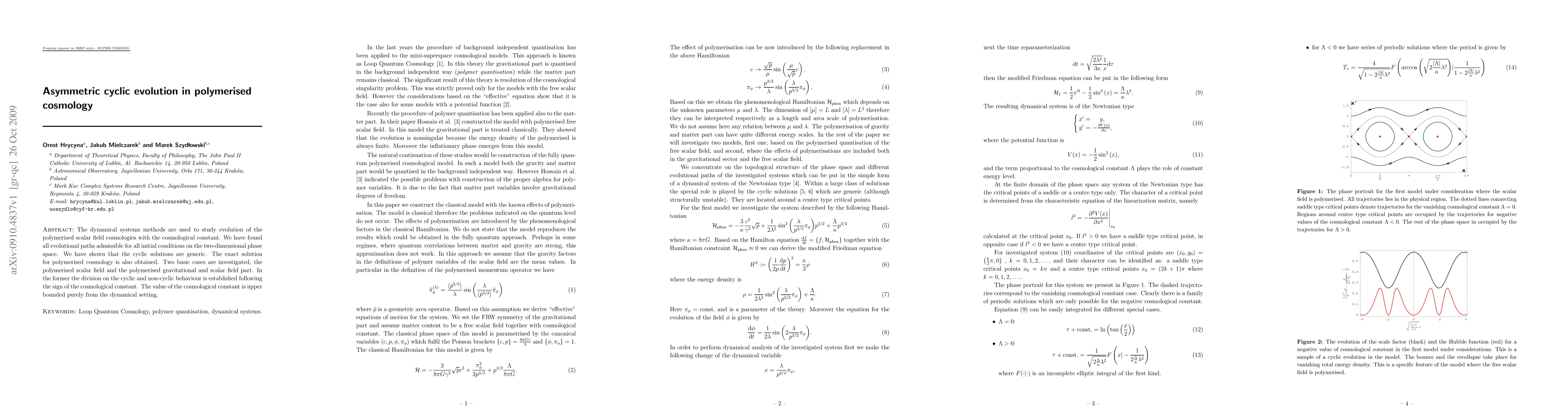 The dynamical systems methods are used to study evolution of the polymerised scalar field cosmologies with the cosmological constant. We have found all evolutional paths admissible for all initial conditions on the two-dimensional phase space. We have shown that the cyclic solutions are generic. The exact solution for polymerised cosmology is also obtained. Two basic cases are investigated, the polymerised scalar field and the polymerised gravitational and scalar field part. In the former the division on the cyclic and non-cyclic behaviour is established following the sign of the cosmological constant. The value of the cosmological constant is upper bounded purely from the dynamical setting.