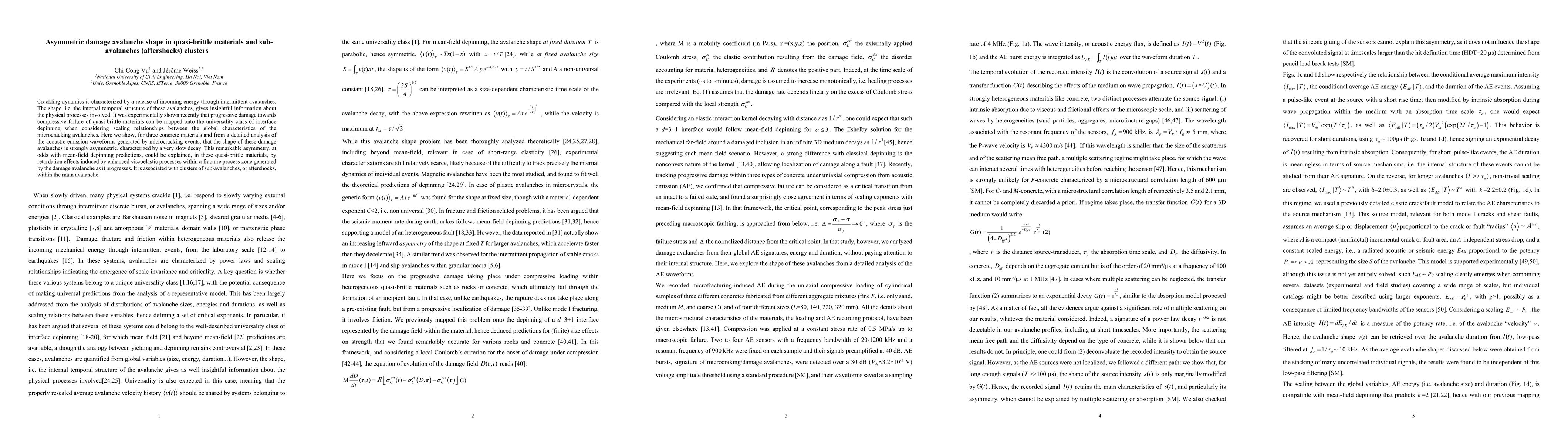This study reveals that the damage avalanches in quasi-brittle materials exhibit a strongly asymmetric shape with a slow decay, deviating from mean-field predictions, likely due to viscoelastic processes within a fracture zone. These asymmetric avalanches are accompanied by clusters of sub-avalanches, or aftershocks.