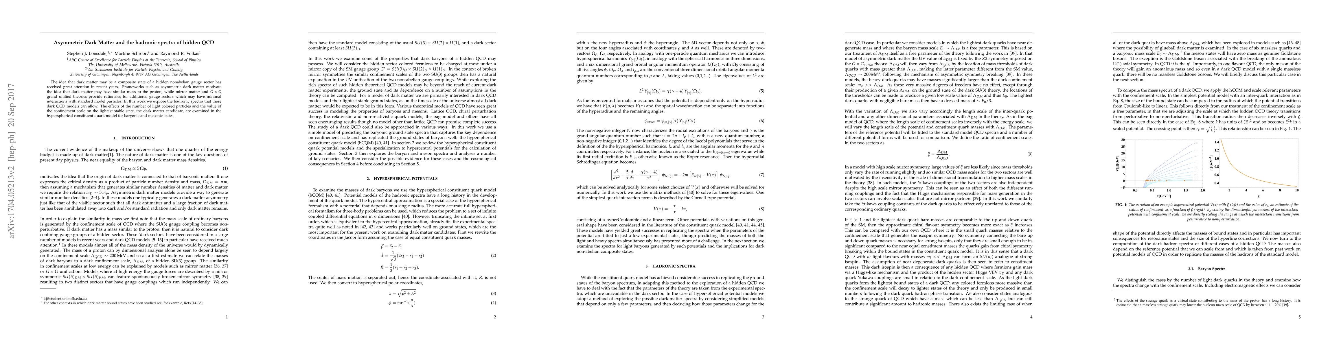 The idea that dark matter may be a composite state of a hidden nonabelian gauge sector has received great attention in recent years. Frameworks such as asymmetric dark matter motivate the idea that dark matter may have similar mass to the proton, while mirror matter and $G \times G$ grand unified theories provide rationales for additional gauge sectors which may have minimal interactions with standard model particles. In this work we explore the hadronic spectra that these dark QCD models can allow. The effects of the number of light colored particles and the value of the confinement scale on the lightest stable state, the dark matter candidate, are examined in the hyperspherical constituent quark model for baryonic and mesonic states.