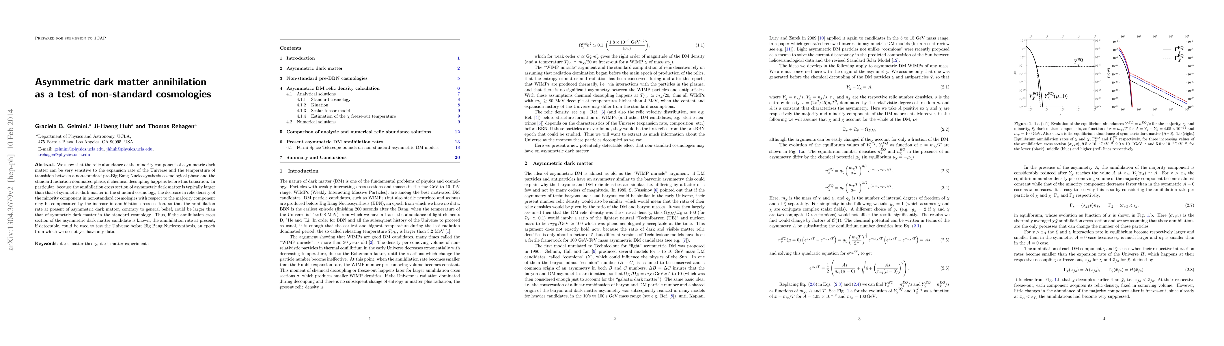 This paper explores how asymmetric dark matter's relic abundance is sensitive to non-standard cosmological phases, suggesting that its annihilation rate could exceed that of symmetric dark matter in standard cosmology due to the higher annihilation cross section. The study highlights the potential of dark matter annihilation as a probe for alternative cosmological models.