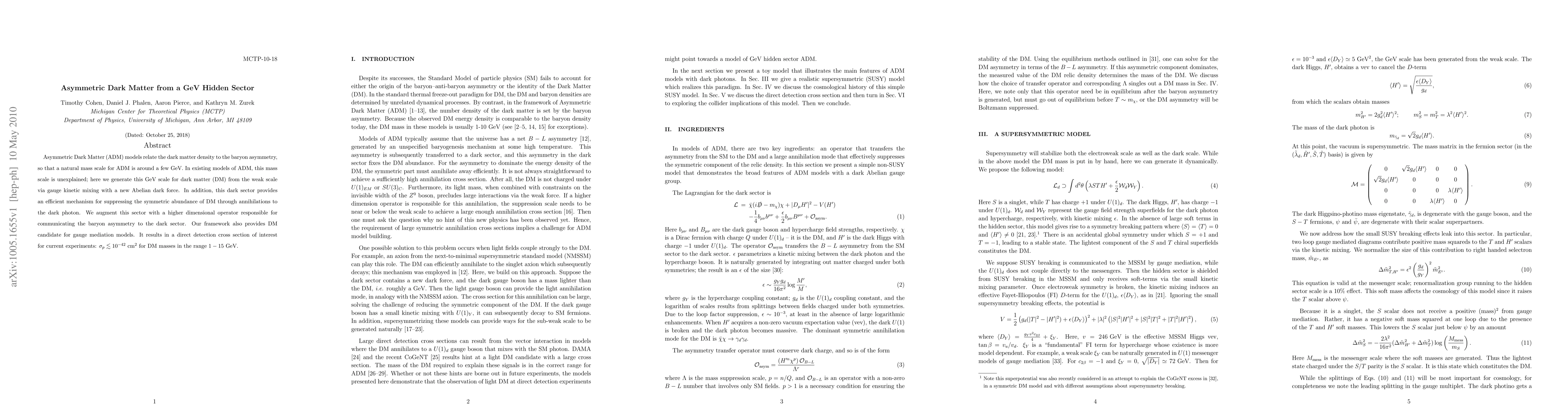 Asymmetric Dark Matter (ADM) models relate the dark matter density to the baryon asymmetry, so that a natural mass scale for ADM is around a few GeV. In existing models of ADM, this mass scale is unexplained; here we generate this GeV scale for dark matter (DM) from the weak scale via gauge kinetic mixing with a new Abelian dark force. In addition, this dark sector provides an efficient mechanism for suppressing the symmetric abundance of DM through annihilations to the dark photon. We augment this sector with a higher dimensional operator responsible for communicating the baryon asymmetry to the dark sector. Our framework also provides DM candidate for gauge mediation models. It results in a direct detection cross section of interest for current experiments: sigma less than or similar to 10^{-42} cm^2 for DM masses in the range 1 - 15 GeV.