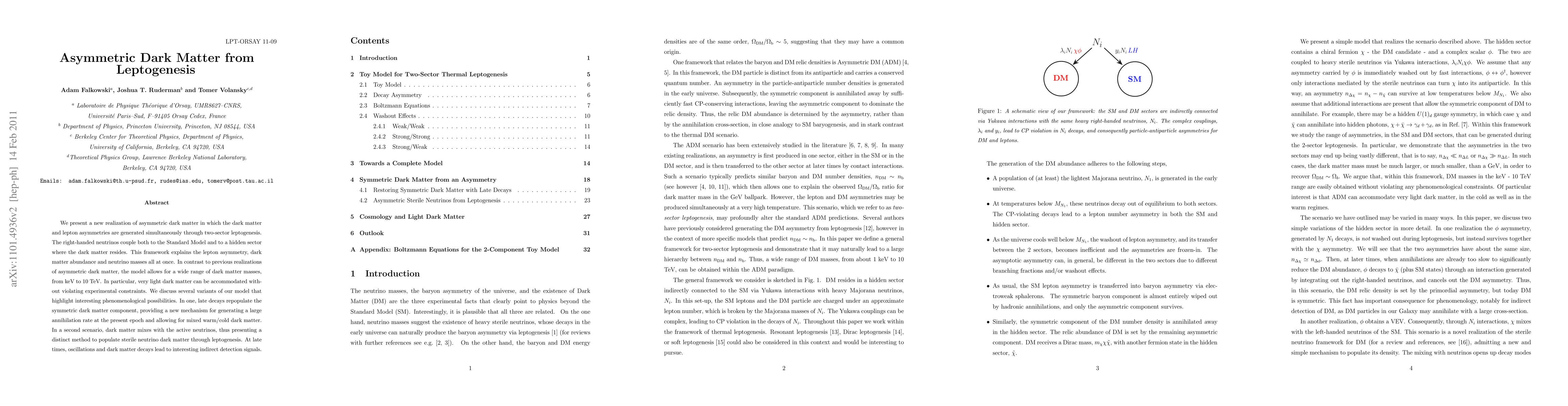 This paper proposes a new model of asymmetric dark matter where dark matter and lepton asymmetries are generated together via two-sector leptogenesis, allowing for a wide range of dark matter masses. It discusses potential phenomenological implications, including mechanisms for mixed dark matter and indirect detection signals.