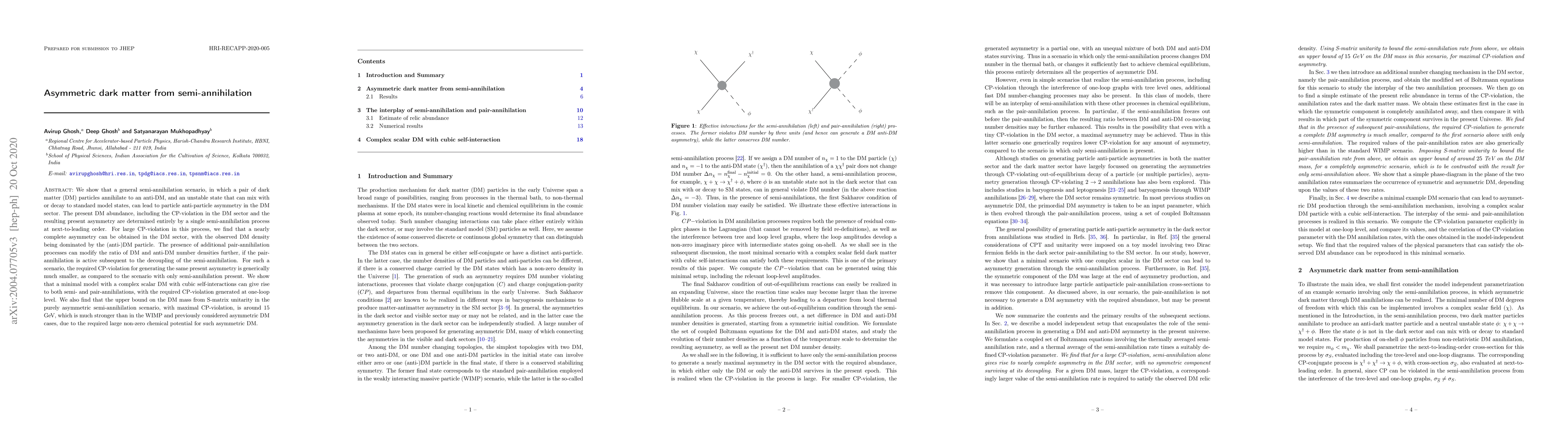 This paper explores a semi-annihilation mechanism for dark matter (DM) that generates a particle-antiparticle asymmetry in the DM sector, leading to the observed DM density. The study finds that large CP-violation in a single semi-annihilation process can nearly completely determine the present DM asymmetry, with a minimal model featuring complex scalar DM and cubic self-interactions.