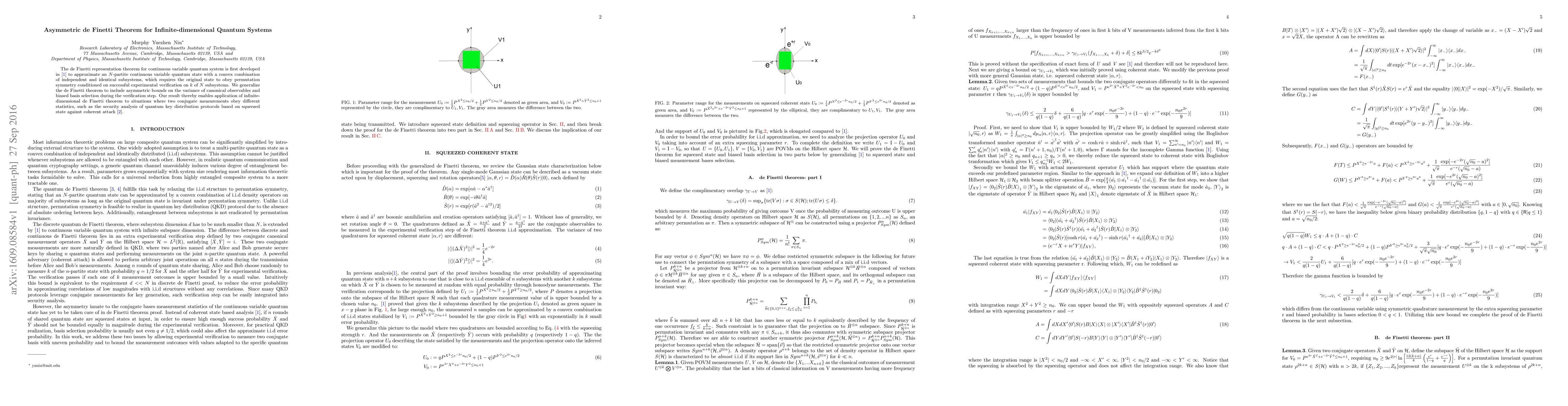 The paper develops an asymmetric de Finetti theorem for infinite-dimensional quantum systems, allowing approximation of N-partite states via independent subsystems under permutation symmetry and generalized variance bounds. This generalization is applied to analyze the security of quantum key distribution protocols using squeezed states against coherent attacks.