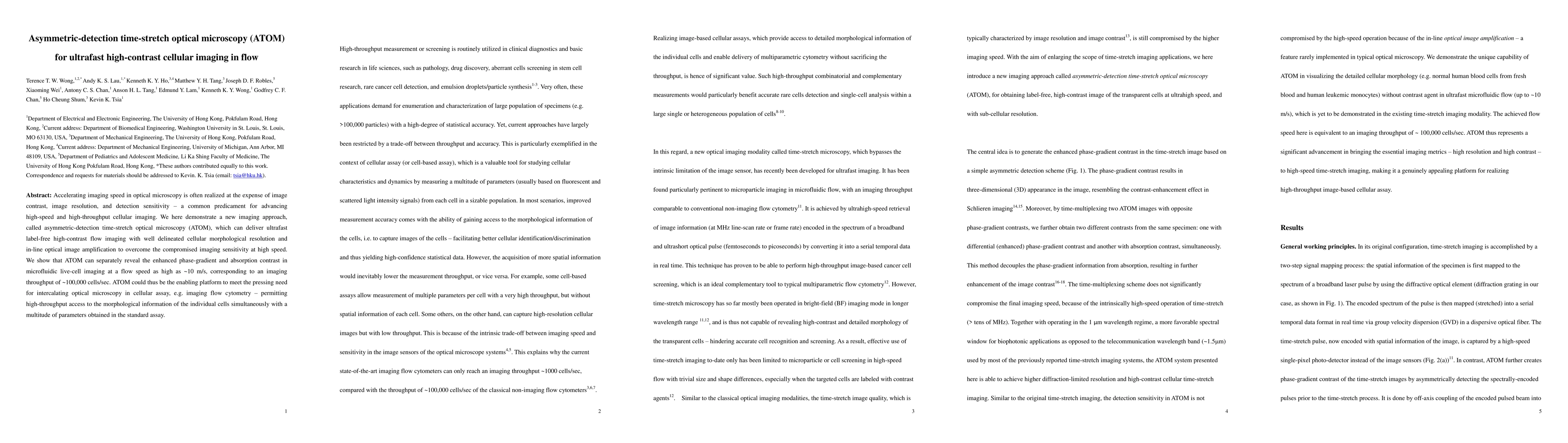 Asymmetric-detection time-stretch optical microscopy (ATOM) enables ultrafast, high-contrast cellular imaging in flow, achieving label-free imaging at speeds up to 10 m/s and throughputs of ~100,000 cells/sec while maintaining morphological resolution and sensitivity. ATOM separates enhanced phase-gradient and absorption contrast, potentially revolutionizing cellular assay and imaging flow cytometry.