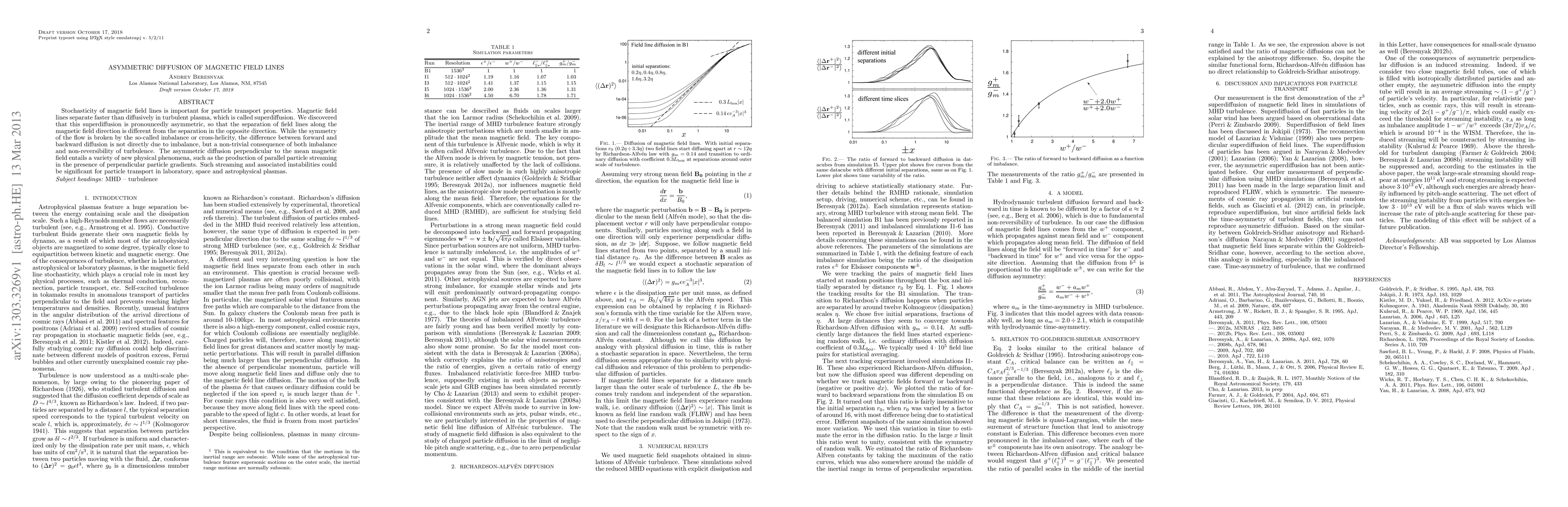Stochasticity of magnetic field lines is important for particle transport properties. Magnetic field lines separate faster than diffusively in turbulent plasma, which is called superdiffusion. We discovered that this superdiffusion is pronouncedly asymmetric, so that the separation of field lines along the magnetic field direction is different from the separation in the opposite direction. While the symmetry of the flow is broken by the so-called imbalance or cross-helicity, the difference between forward and backward diffusion is not directly due to imbalance, but a non-trivial consequence of both imbalance and non-reversibility of turbulence. The asymmetric diffusion perpendicular to the mean magnetic field entails a variety of new physical phenomena, such as the production of parallel particle streaming in the presence of perpendicular particle gradients. Such streaming and associated instabilities could be significant for particle transport in laboratory, space and astrophysical plasmas.