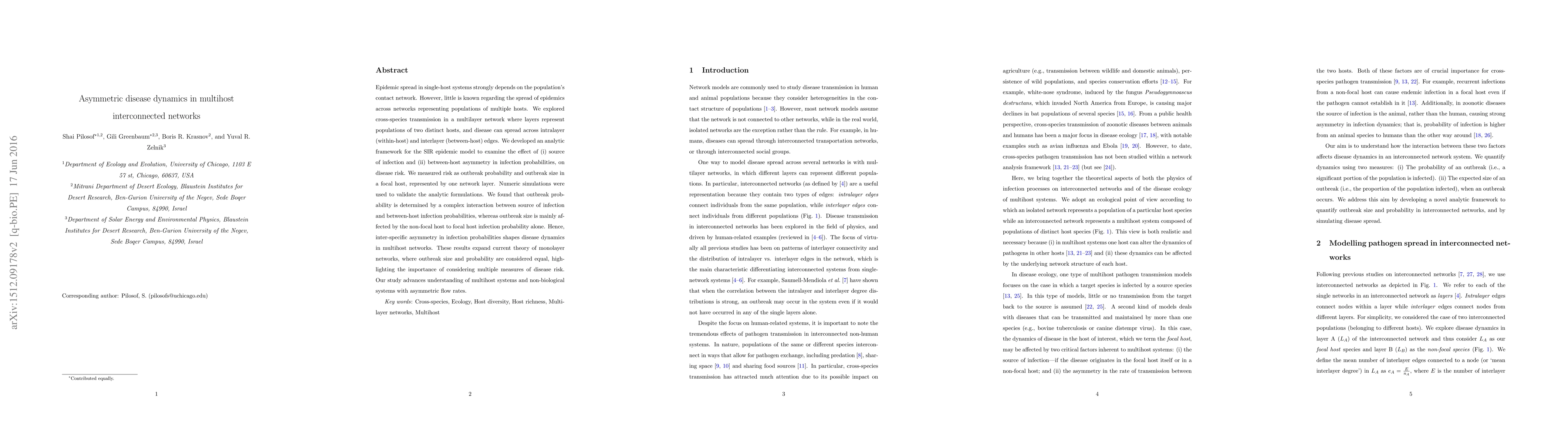 Epidemic spread in single-host systems strongly depends on the population's contact network. However, little is known regarding the spread of epidemics across networks representing populations of multiple hosts. We explored cross-species transmission in a multilayer network where layers represent populations of two distinct hosts, and disease can spread across intralayer (within-host) and interlayer (between-host) edges. We developed an analytic framework for the SIR epidemic model to examine the effect of (i) source of infection and (ii) between-host asymmetry in infection probabilities, on disease risk. We measured risk as outbreak probability and outbreak size in a focal host, represented by one network layer. Numeric simulations were used to validate the analytic formulations. We found that outbreak probability is determined by a complex interaction between source of infection and between-host infection probabilities, whereas outbreak size is mainly affected by the non-focal host to focal host infection probability alone. Hence, inter-specific asymmetry in infection probabilities shapes disease dynamics in multihost networks. These results expand current theory of monolayer networks, where outbreak size and probability are considered equal, highlighting the importance of considering multiple measures of disease risk. Our study advances understanding of multihost systems and non-biological systems with asymmetric flow rates.