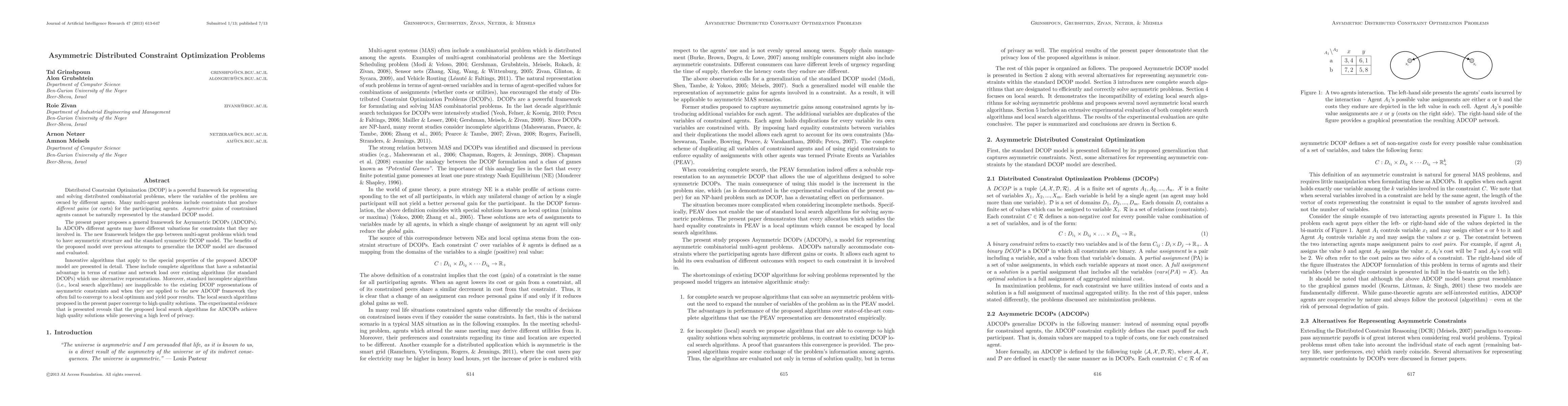This paper introduces a framework for Asymmetric Distributed Constraint Optimization Problems (ADCOPs), which allows different agents to have distinct valuations for shared constraints. It proposes innovative algorithms that outperform existing DCOP methods, especially in runtime and network load efficiency, and presents local search algorithms that converge to high-quality solutions while maintaining privacy.