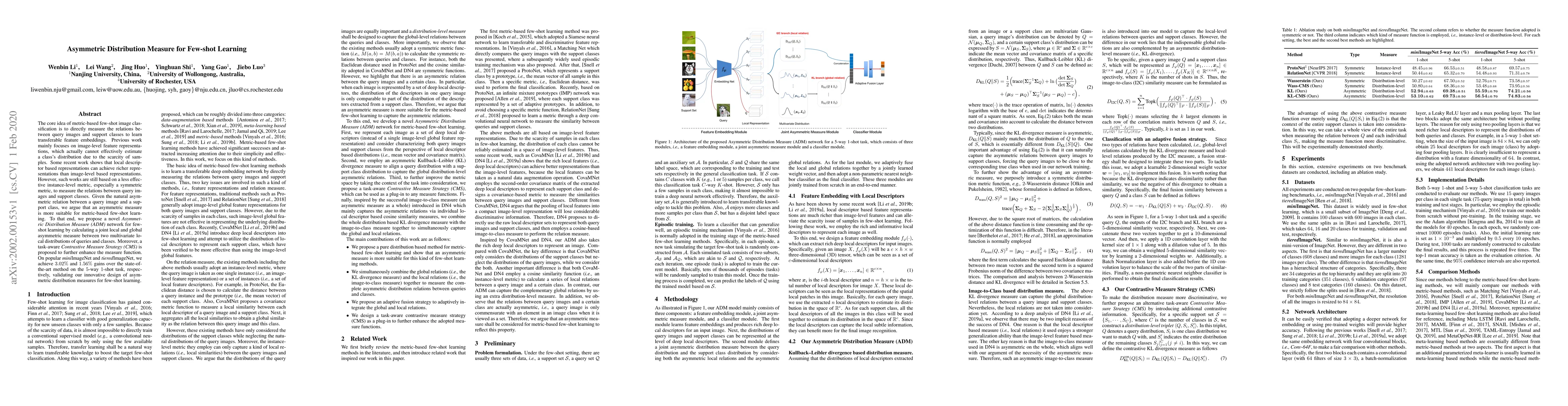 This paper proposes an Asymmetric Distribution Measure (ADM) network for few-shot learning, utilizing a joint local and global asymmetric metric to better capture the relationship between query images and support classes. The task-aware Contrastive Measure Strategy (CMS) further enhances the measure function, achieving notable improvements over state-of-the-art methods on miniImageNet and tieredImageNet datasets.