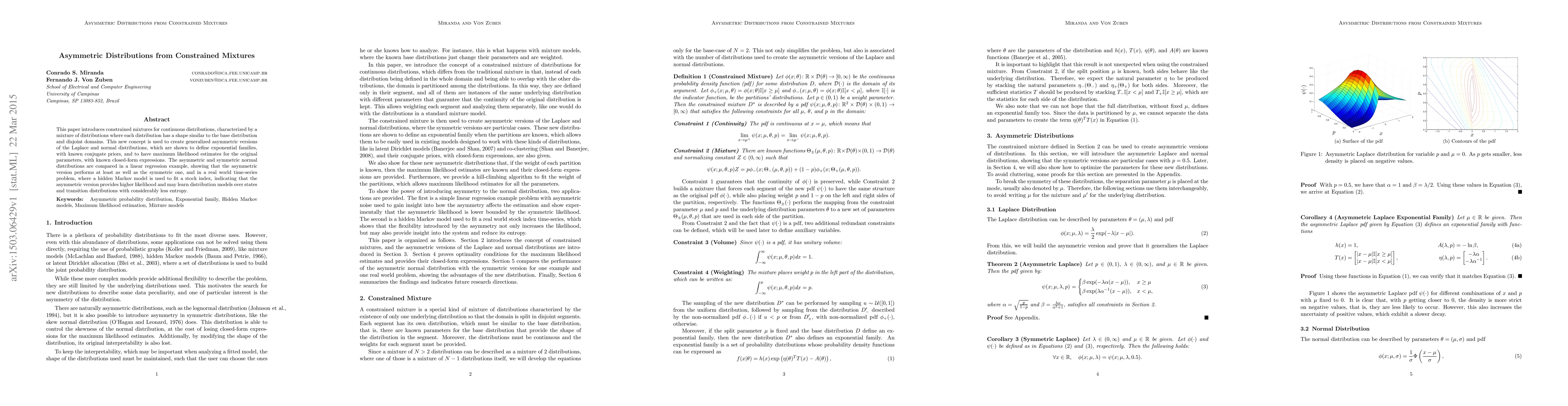 This paper introduces constrained mixtures for continuous distributions, characterized by a mixture of distributions where each distribution has a shape similar to the base distribution and disjoint domains. This new concept is used to create generalized asymmetric versions of the Laplace and normal distributions, which are shown to define exponential families, with known conjugate priors, and to have maximum likelihood estimates for the original parameters, with known closed-form expressions. The asymmetric and symmetric normal distributions are compared in a linear regression example, showing that the asymmetric version performs at least as well as the symmetric one, and in a real world time-series problem, where a hidden Markov model is used to fit a stock index, indicating that the asymmetric version provides higher likelihood and may learn distribution models over states and transition distributions with considerably less entropy.
