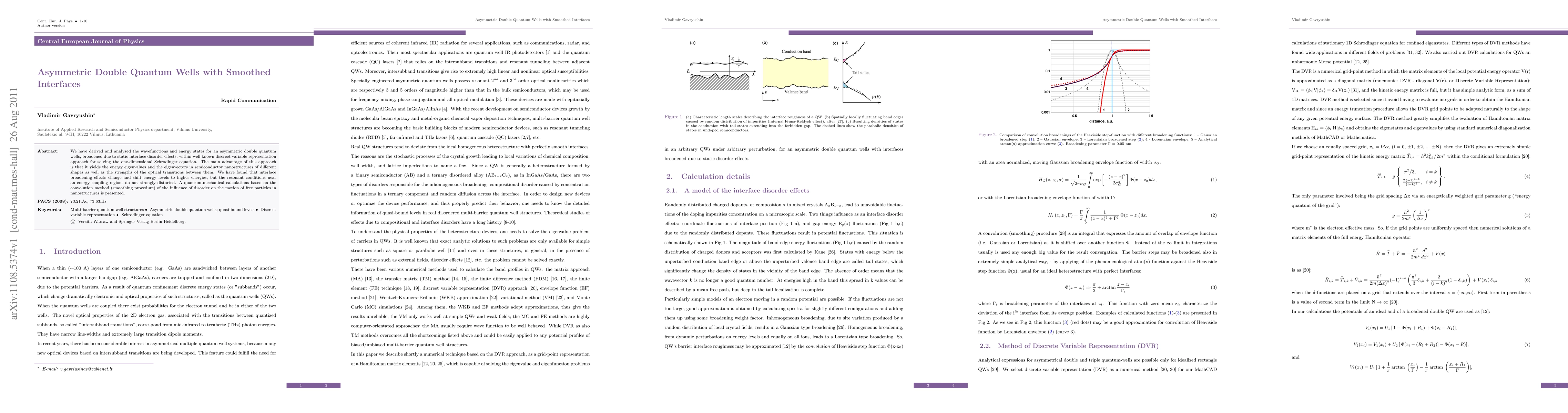 We have derived and analyzed the wavefunctions and energy states for an asymmetric double quantum wells, broadened due to static interface disorder effects, within well known discreet variable representation approach for solving the one-dimensional Schrodinger equation. The main advantage of this approach is that it yields the energy eigenvalues and the eigenvectors in semiconductor nanostructures of different shapes as well as the strengths of the optical transitions between them. We have found that interface broadening effects change and shift energy levels to higher energies, but the resonant conditions near an energy coupling regions do not strongly distorted. A quantum-mechanical calculations based on the convolution method (smoothing procedure) of the influence of disorder on the motion of free particles in nanostructures is presented.
