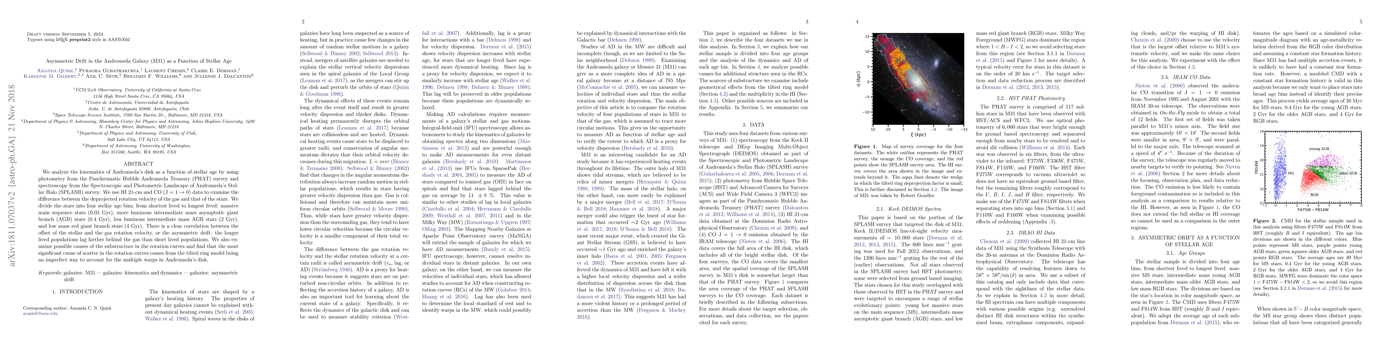 We analyze the kinematics of Andromeda's disk as a function of stellar age by using photometry from the Panchromatic Hubble Andromeda Treasury (PHAT) survey and spectroscopy from the Spectroscopic and Photometric Landscape of Andromeda's Stellar Halo (SPLASH) survey. We use HI 21-cm and CO ($\rm J=1 \rightarrow 0$) data to examine the difference between the deprojected rotation velocity of the gas and that of the stars. We divide the stars into four stellar age bins, from shortest lived to longest lived: massive main sequence stars (0.03 Gyr), more luminous intermediate mass asymptotic giant branch (AGB) stars (0.4 Gyr), less luminous intermediate mass AGB stars (2 Gyr), and low mass red giant branch stars (4 Gyr). There is a clear correlation between the offset of the stellar and the gas rotation velocity, or the asymmetric drift: the longer lived populations lag farther behind the gas than short lived populations. We also examine possible causes of the substructure in the rotation curves and find that the most significant cause of scatter in the rotation curves comes from the tilted ring model being an imperfect way to account for the multiple warps in Andromeda's disk.