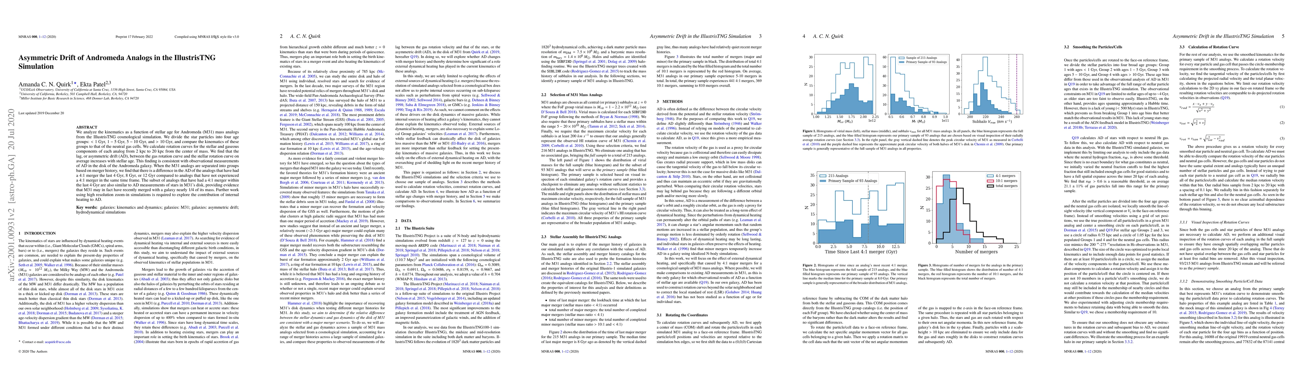 We analyze the kinematics as a function of stellar age for Andromeda (M31) mass analogs from the IllustrisTNG cosmological simulation. We divide the star particles into four age groups: less than 1 Gyr, 1 to 5 Gyr, 5 to 10 Gyr, and greater 10 Gyr, and compare the kinematics of these groups to that of the neutral gas cells. We calculate rotation curves for the stellar and gaseous components of each analog from 2 kpc to 20 kpc from the center of mass. We find that the lag, or asymmetric drift (AD), between the gas rotation curve and the stellar rotation curve on average increases with stellar age. This finding is consistent with observational measurements of AD in the disk of the Andromeda galaxy. When the M31 analogs are separated into groups based on merger history, we find that there is a difference in the AD of the analogs that have had a 4:1 merger the last 4 Gyr, 8 Gyr, or 12 Gyr compared to analogs that have not experienced a 4:1 merger in the same time frame. The subset of analogs that have had a 4:1 merger within the last 4 Gyr are also similar to AD measurements of stars in the disk of M31, providing evidence that M31 may in fact have recently merged with a galaxy nearly one fourth of its mass. Further work using high resolution zoom in simulations is required to explore the contribution of internal heating to AD.