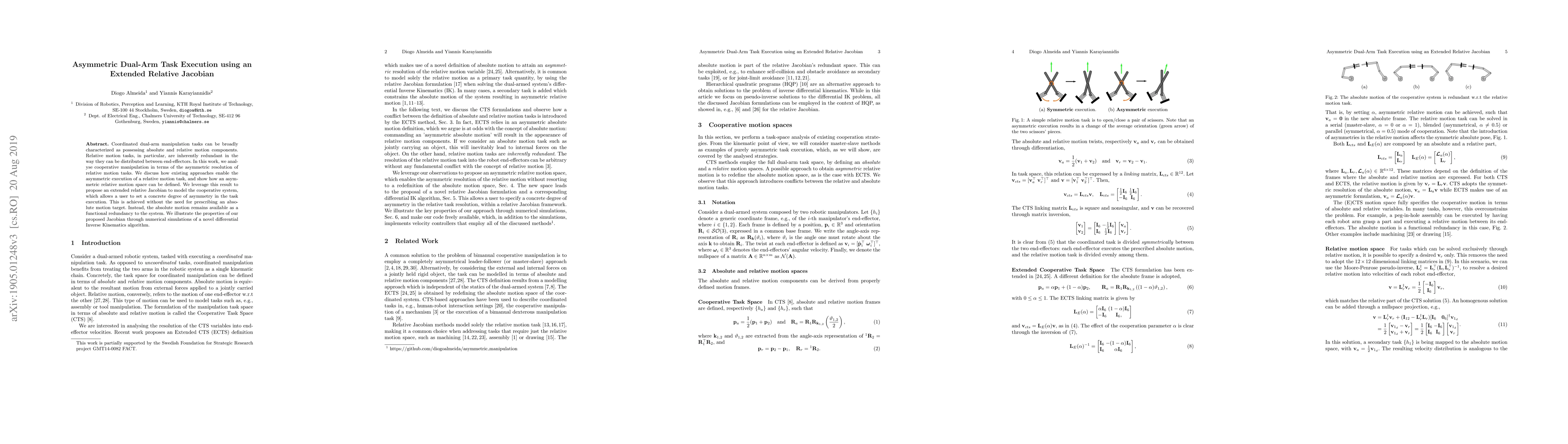 This paper proposes an extended relative Jacobian for asymmetric dual-arm task execution, allowing users to set a degree of asymmetry without prescribing absolute motion targets. Numerical simulations demonstrate the effectiveness of the new differential Inverse Kinematics algorithm.