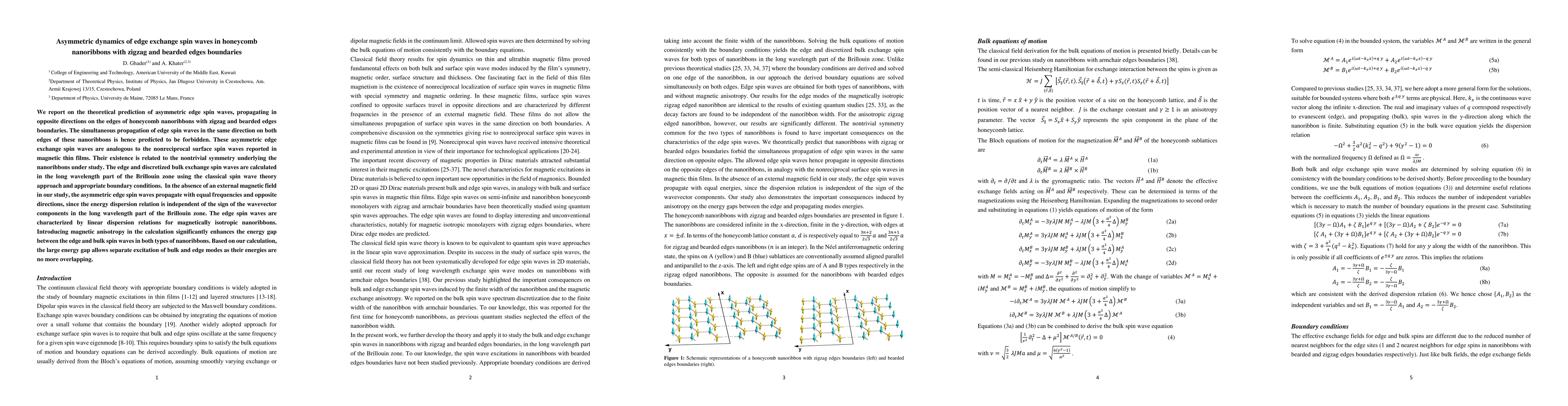 We report on the theoretical prediction of asymmetric edge spin waves, propagating in opposite directions on the edges of honeycomb nanoribbons with zigzag and bearded edges boundaries. The simultaneous propagation of edge spin waves in the same direction on both edges of these nanoribbons is hence predicted to be forbidden. These asymmetric edge exchange spin waves are analogous to the nonreciprocal surface spin waves reported in magnetic thin films. Their existence is related to the nontrivial symmetry underlying the nanoribbons under study. The edge and discretized bulk exchange spin waves are calculated in the long wavelength part of the Brillouin zone using the classical spin wave theory approach and appropriate boundary conditions. In the absence of an external magnetic field in our study, the asymmetric edge spin waves propagate with equal frequencies and opposite directions, since the energy dispersion relation is independent of the sign of the wavevector components in the long wavelength part of the Brillouin zone. The edge spin waves are characterized by linear dispersion relations for magnetically isotropic nanoribbons. Introducing magnetic anisotropy in the calculation significantly enhances the energy gap between the edge and bulk spin waves in both types of nanoribbons. Based on our calculation, the large energy gap allows separate excitation of bulk and edge modes as their energies are no more overlapping.