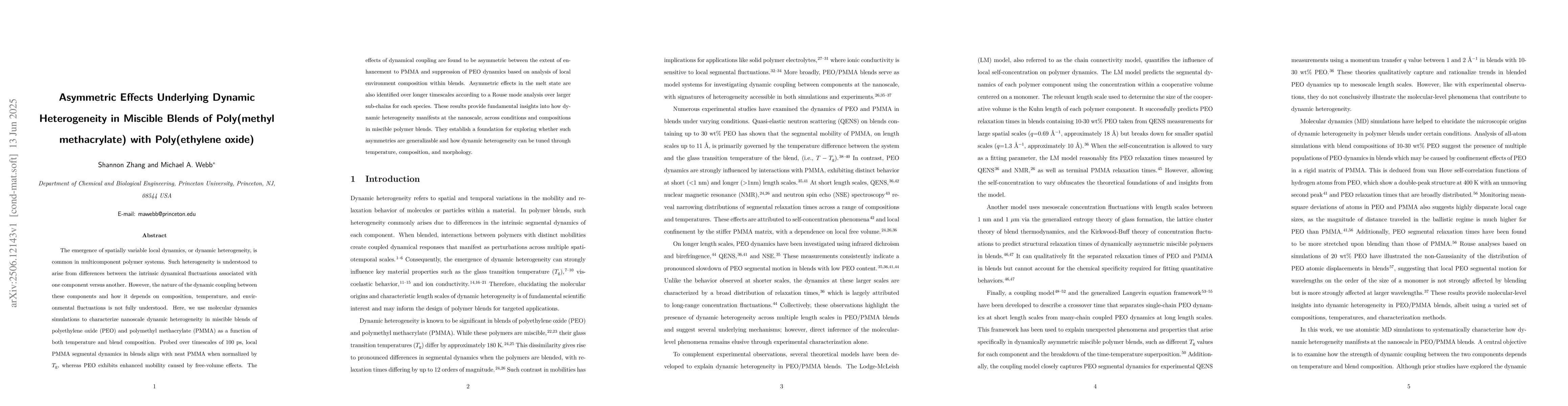 The emergence of spatially variable local dynamics, or dynamic heterogeneity, is common in multicomponent polymer systems. Such heterogeneity is understood to arise from differences between the intrinsic dynamical fluctuations associated with one component versus another. However, the nature of the dynamic coupling between these components and how it depends on composition, temperature, and environmental fluctuations is not fully understood. Here, we use molecular dynamics simulations to characterize nanoscale dynamic heterogeneity in miscible blends of polyethylene oxide (PEO) and polymethyl methacrylate (PMMA) as a function of both temperature and blend composition. Probed over timescales of 100~ps, local PMMA segmental dynamics in blends align with neat PMMA when normalized by $T_\text{g}$, whereas PEO exhibits enhanced mobility caused by free-volume effects. The effects of dynamical coupling are found to be asymmetric between the extent of enhancement to PMMA and suppression of PEO dynamics based on analysis of local environment composition within blends. Asymmetric effects in the melt state are also identified over longer timescales according to a Rouse mode analysis over larger sub-chains for each species. These results provide fundamental insights into how dynamic heterogeneity manifests at the nanoscale, across conditions and compositions in miscible polymer blends. They establish a foundation for exploring whether such asymmetries are generalizable and how dynamic heterogeneity can be tuned through temperature, composition, and morphology.